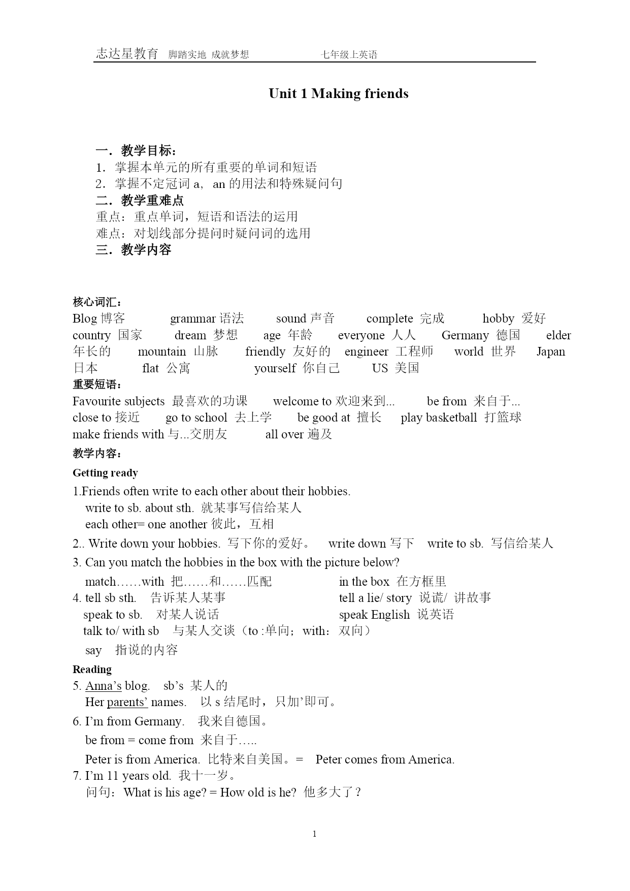 志达星教育脚踏实地成就梦想七年级上英语Unit1Makingfriends一.教学目标:1.掌握本单元的所有重要的单词和短语2.掌握不定冠词a,an的用法和特殊疑问句二.教学重难点重点:重点单词,短语和语法的运用难点:对划线部分提问时疑问词的选用三.教学内容核心词汇:Blog博客grammar语法sound声音complete完成hobby爱好country国家dream梦想age年龄everyone人人Germany德国elder年长的mountain山脉friendly友