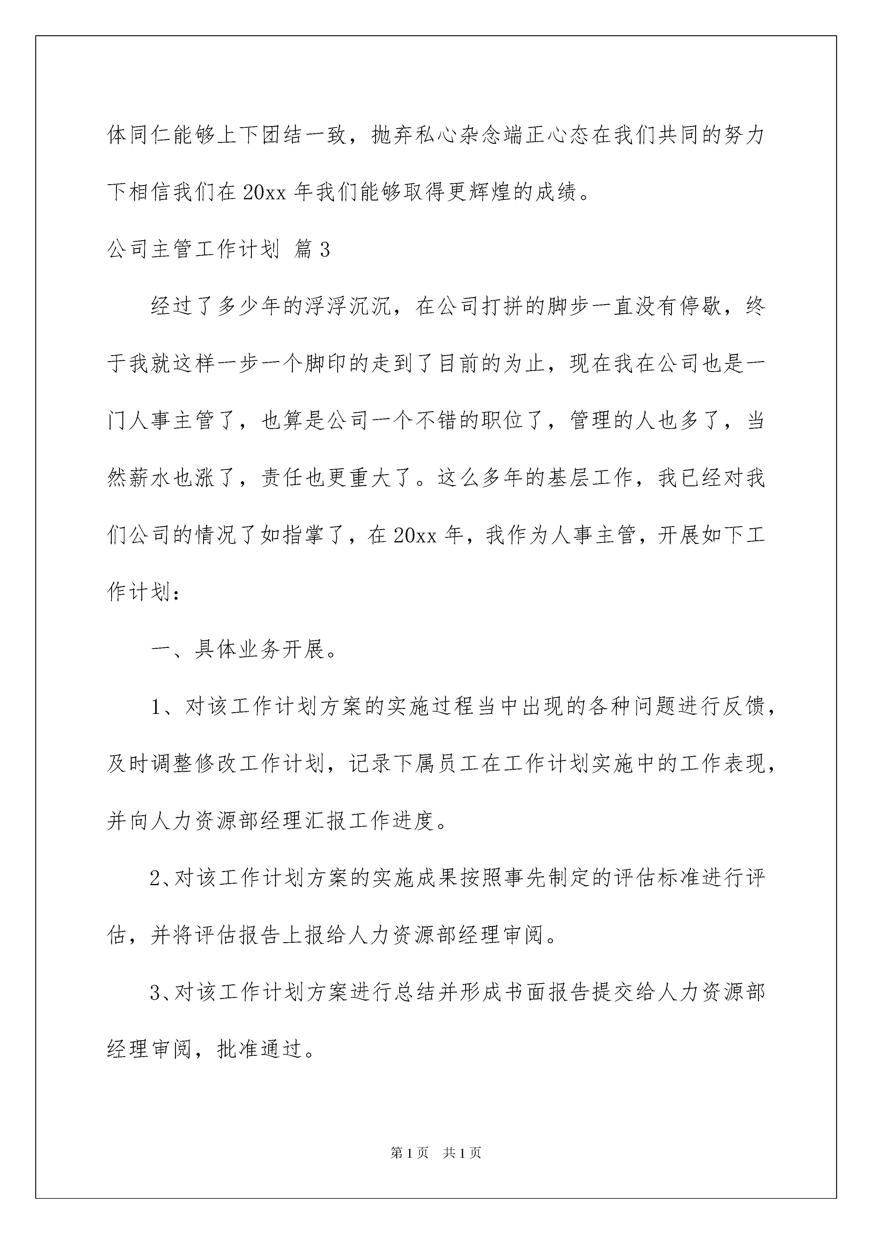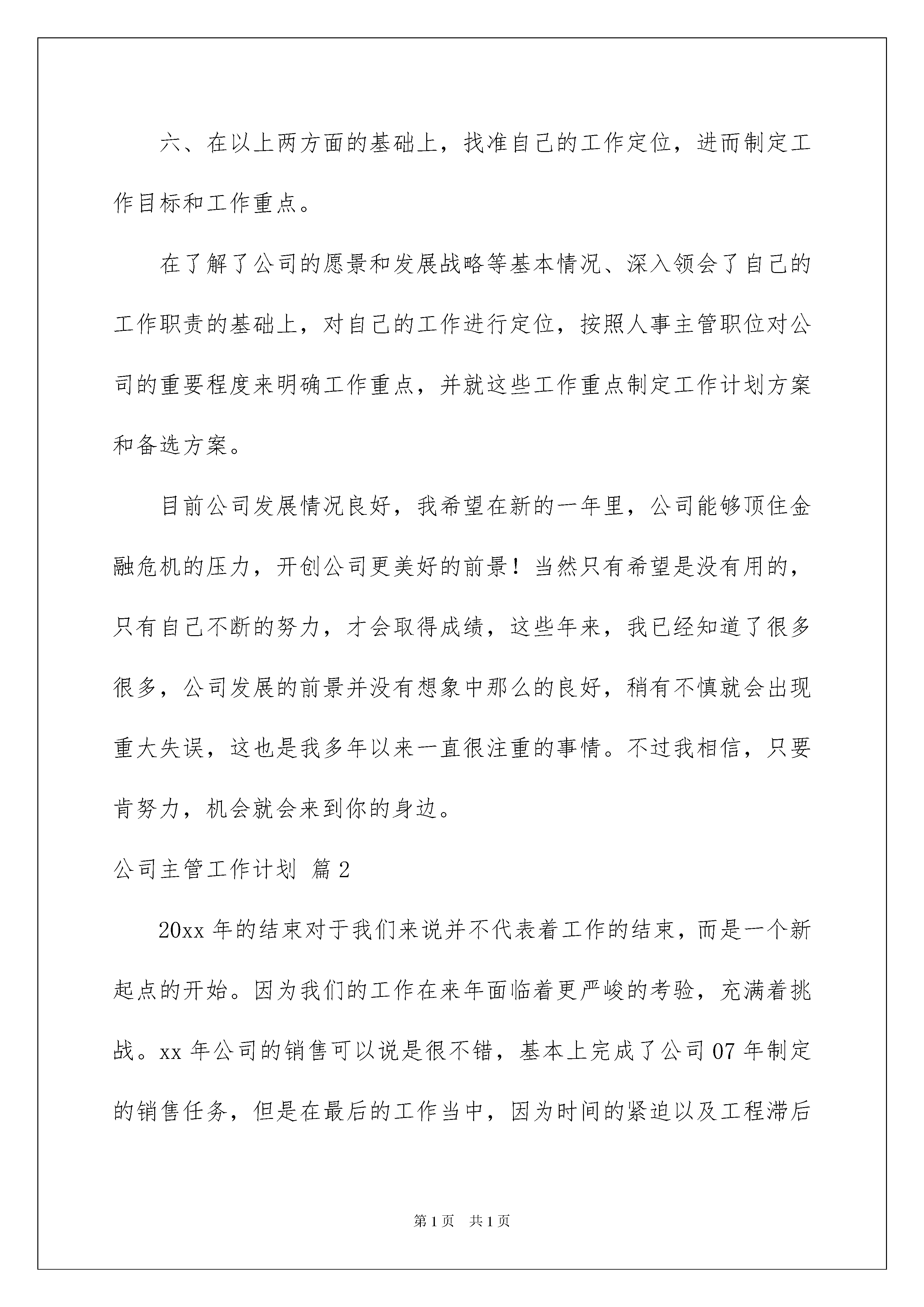 2022关于公司主管工作计划合集六篇关于公司主管工作计划合集六篇时间过得太快让人猝不及防我们又将迎来新的喜悦、新的收获我们要好好计划今后的工作方法。相信许多人会觉得工作计划很难写吧以下是我为大家收集的公司主管工作计划9篇欢迎阅