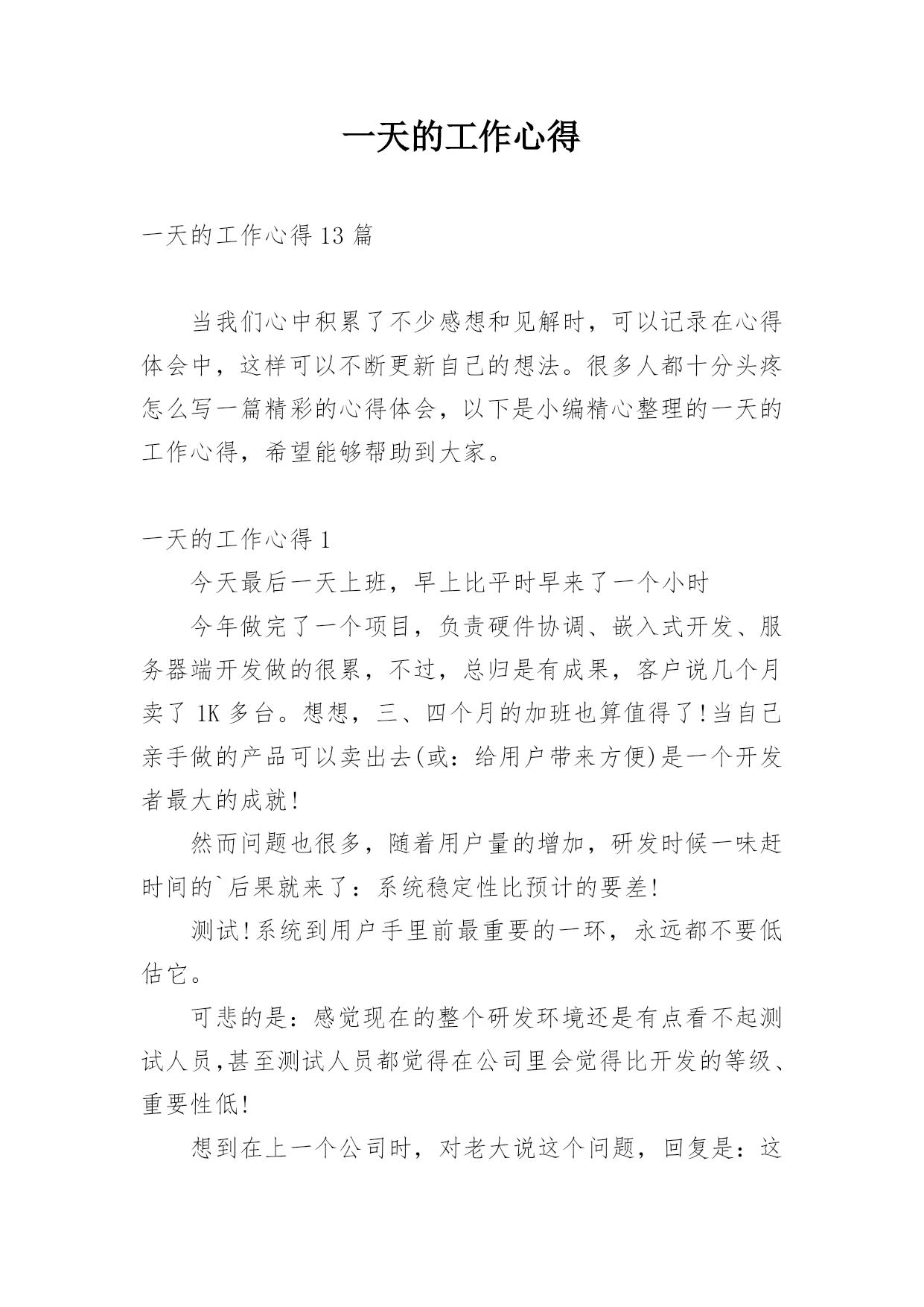 一天的工作心得一天的工作心得13篇当我们心中积累了不少感想和见解时,可以记录在心得体会中,这样可以不断更新自己的想法。很多人都十分头疼怎么写一篇精彩的心得体会,以下是小编精心整理的一天的工作心得,希望能够帮助到大家。一天的工作心得1今天最后一天上班,早上比平时早来了一个小时今年做完了一个项目,负责硬件协调、嵌入式开发、服务器端开发做的很累,不过,总归是有成果,客户说几个月卖了1K多台。想想,三、四个月的加班也算值得了!当自己亲手做的产品可以卖出去(或:给用户带来方便)是一个开发者最大的成就!然而问题也很多