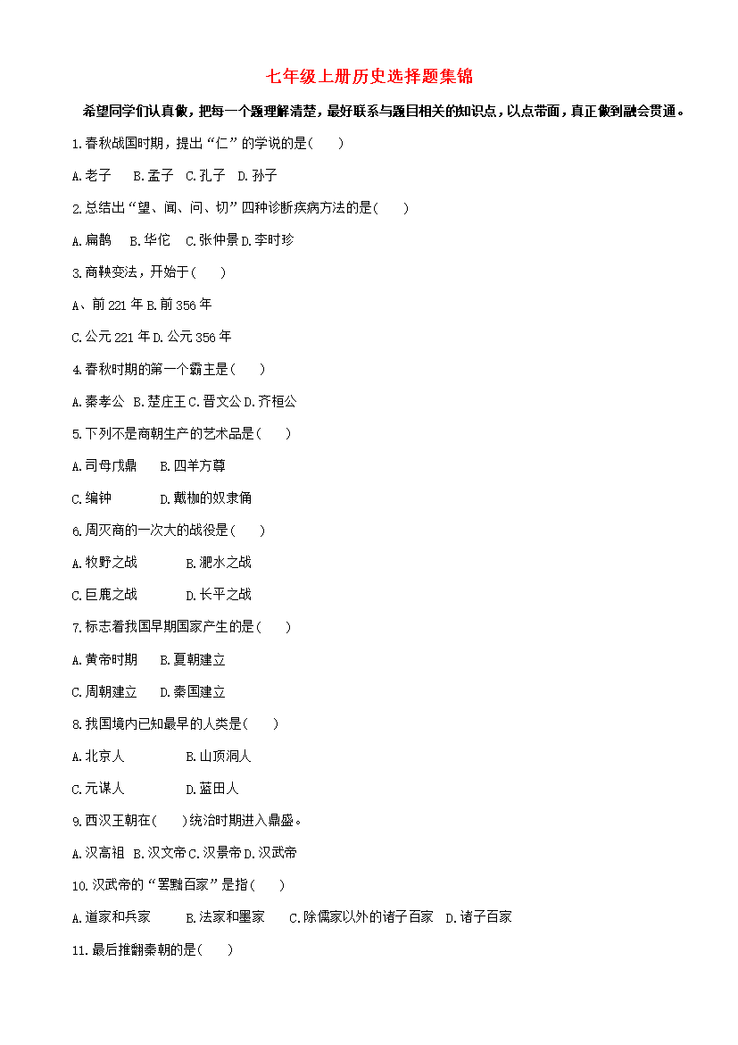 七年级上册历史选择题集锦希望同学们认真做把每一个题理解清楚最好联系与题目相关的知识点以点带面真正做到融会贯通。1.春秋战国时期提出“仁”的学说的是()A.老子B.孟子C.孔子D.孙子2.总结出“望、闻、问、切”四种诊断疾病方法的是()A.扁鹊B.华佗C.张仲景D.李时珍3.商鞅变法开始于()A、前221年B.前356年C.公元221年D.公元356年4.春秋时期的第一个霸主是()A.秦孝公B.楚庄王C.晋文公D.齐桓公5.下列不是商朝生产的艺术品是()A.司