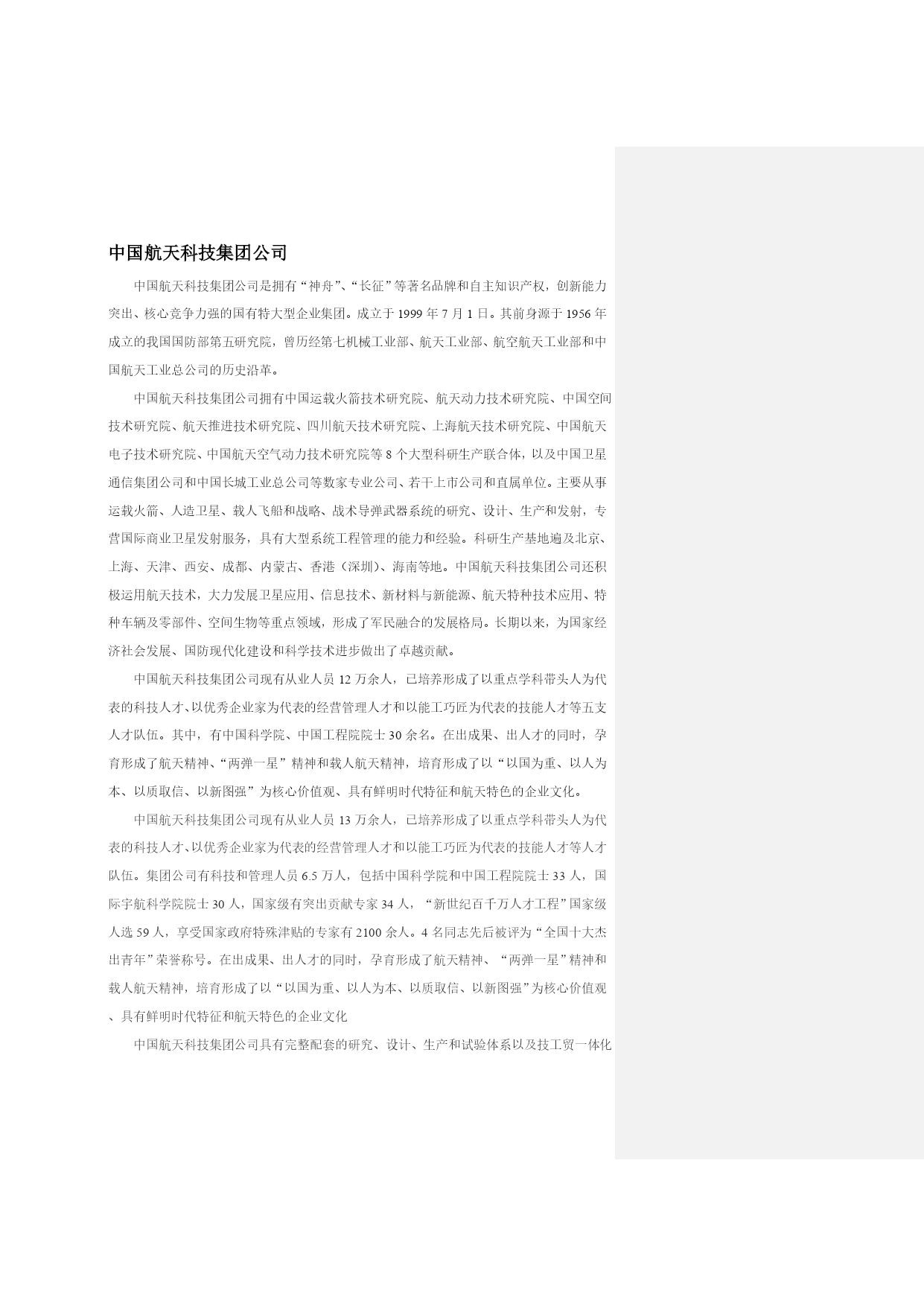 中国航天科技集团公司中国航天科技集团公司源于1956年10月8日成立的国防部第五研究院,经过第七机械工业部、航天工业部、航空航天工业部、中国航天工业总公司的历史沿革,经国务院批准,于1999年7月1日正式组建成立。中国航天科技集团公司是拥有“神舟”、“长征”等著名品牌和自主知识产权、创新能力突出、核心竞争力强的国有特大型企业集团。作为国家授权投资的机构,中国航天科技集团公司拥有中国运载火箭技术研究院、中国空间技术研究院、航天动力技术研究院、航天推进技术研究院、上海航天技术研究院、四川航天技术研究院、中国航