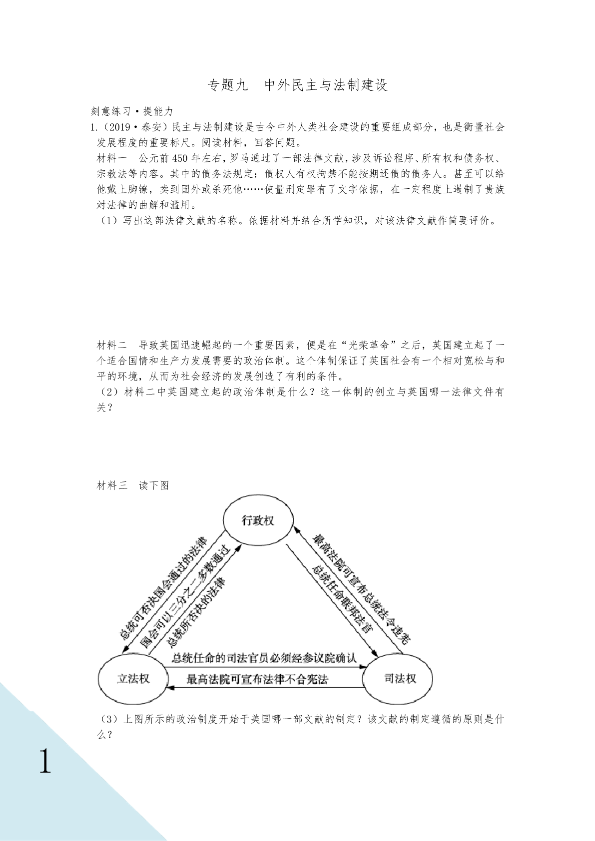 专题九中外民主与法制建设刻意练习·提能力1.(2019·泰安)民主与法制建设是古今中外人类社会建设的重要组成部分,也是衡量社会发展程度的重要标尺。阅读材料,回答问题。材料一公元前450年左右,罗马通过了一部法律文献,涉及诉讼程序、所有权和债务权、宗教法等内容。其中的债务法规定:债权人有权拘禁不能按期还债的债务人。甚至可以给他戴上脚镣,卖到国外或杀死他……使量刑定罪有了文字依据,在一定程度上遏制了贵族対法律的曲解和滥用。(1)写出这部法律文献的名称。依据材料并结合所学知识,对该法律文献作简要评价。材料二导致