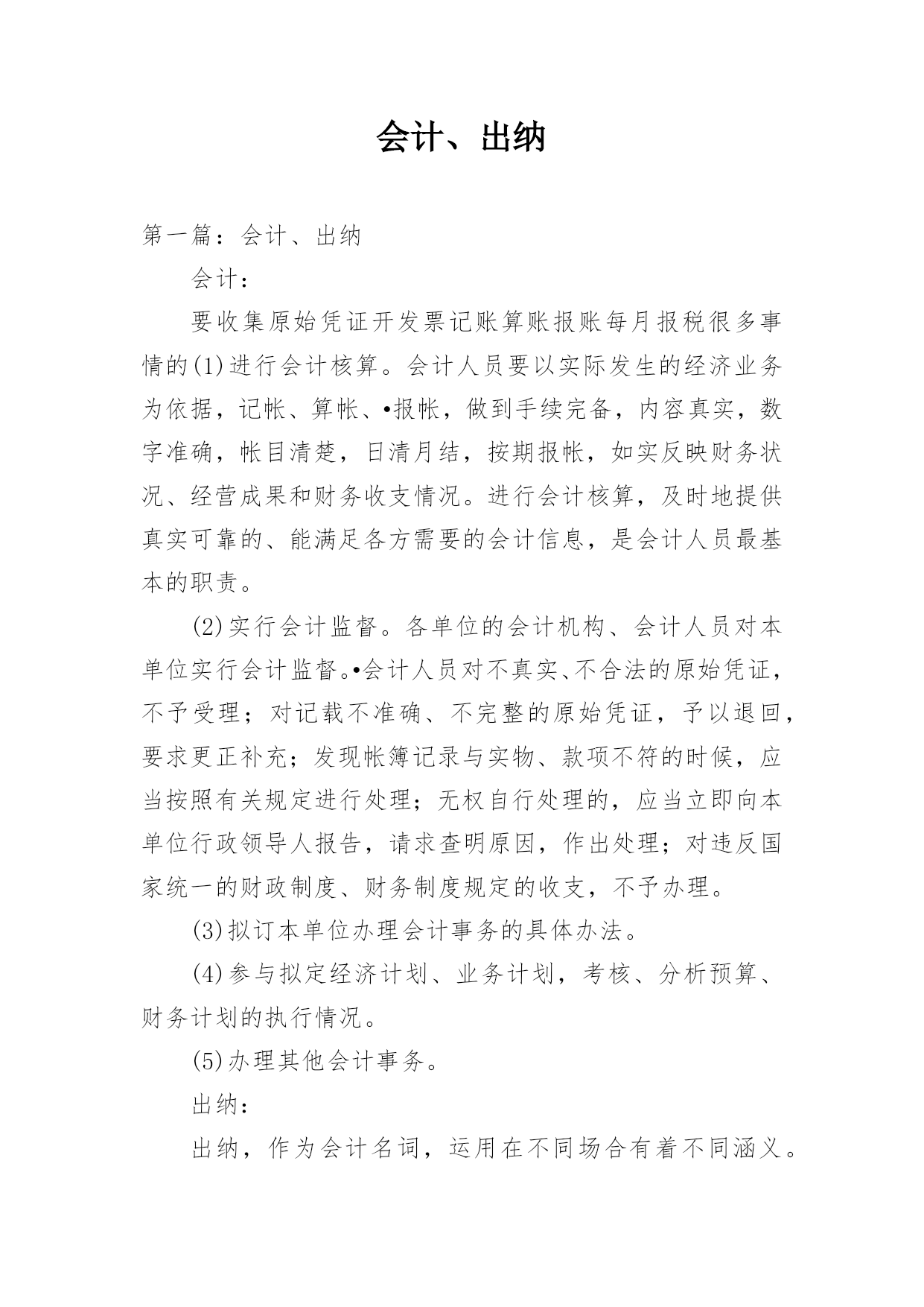 会计、出纳第一篇:会计、出纳会计:要收集原始凭证开发票记账算账报账每月报税很多事情的(1)进行会计核算。会计人员要以实际发生的经济业务为依据,记帐、算帐、•报帐,做到手续完备,内容真实,数字准确,帐目清楚,日清月结,按期报帐,如实反映财务状况、经营成果和财务收支情况。进行会计核算,及时地提供真实可靠的、能满足各方需要的会计信息,是会计人员最基本的职责。(2)实行会计监督。各单位的会计机构、会计人员对本单位实行会计监督。•会计人员对不真实、不合法的原始凭证,不予受理;对记载不准确、不完整的原始凭证,予以退回