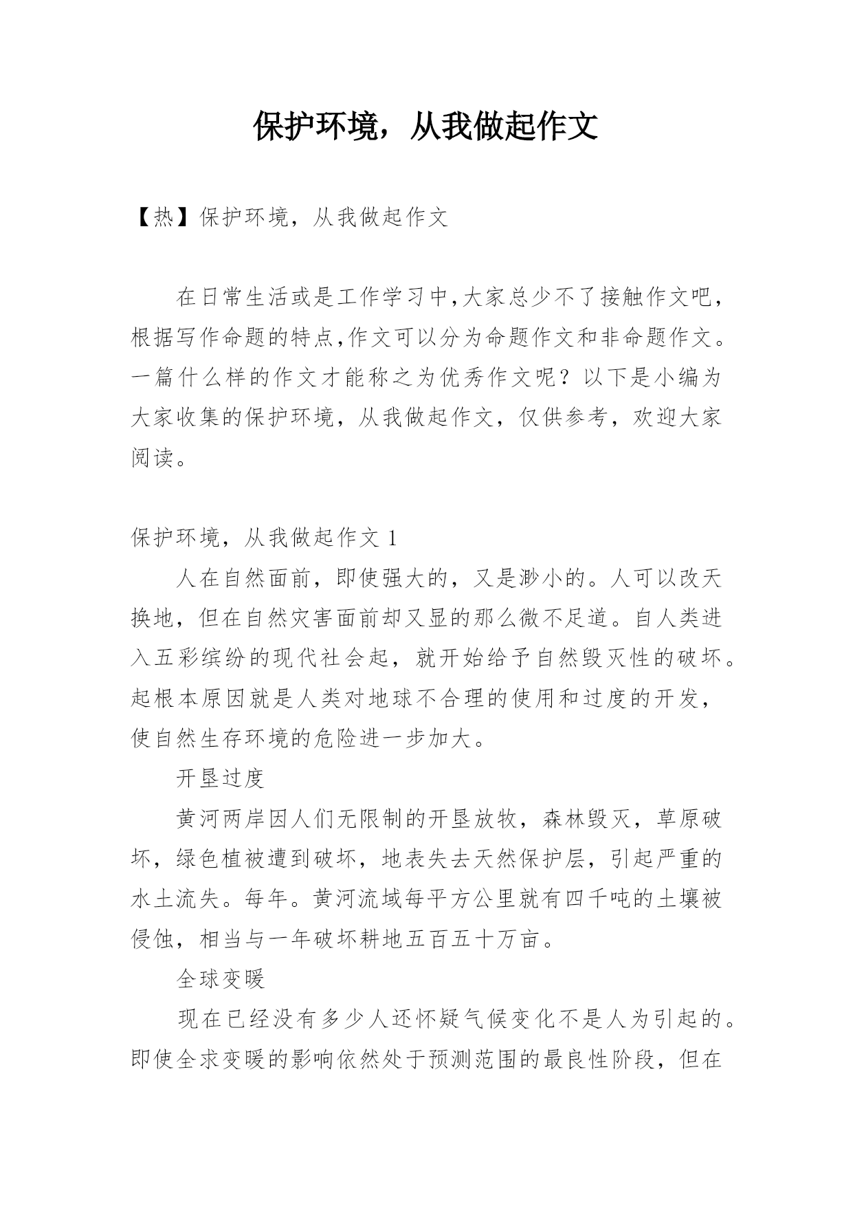 保护环境,从我做起作文【热】保护环境,从我做起作文在日常生活或是工作学习中,大家总少不了接触作文吧,根据写作命题的特点,作文可以分为命题作文和非命题作文。一篇什么样的作文才能称之为优秀作文呢?以下是小编为大家收集的保护环境,从我做起作文,仅供参考,欢迎大家阅读。保护环境,从我做起作文1人在自然面前,即使强大的,又是渺小的。人可以改天换地,但在自然灾害面前却又显的那么微不足道。自人类进入五彩缤纷的现代社会起,就开始给予自然毁灭性的破坏。起根本原因就是人类对地球不合理的使用和过度的开发,使自然生存环境的危险进