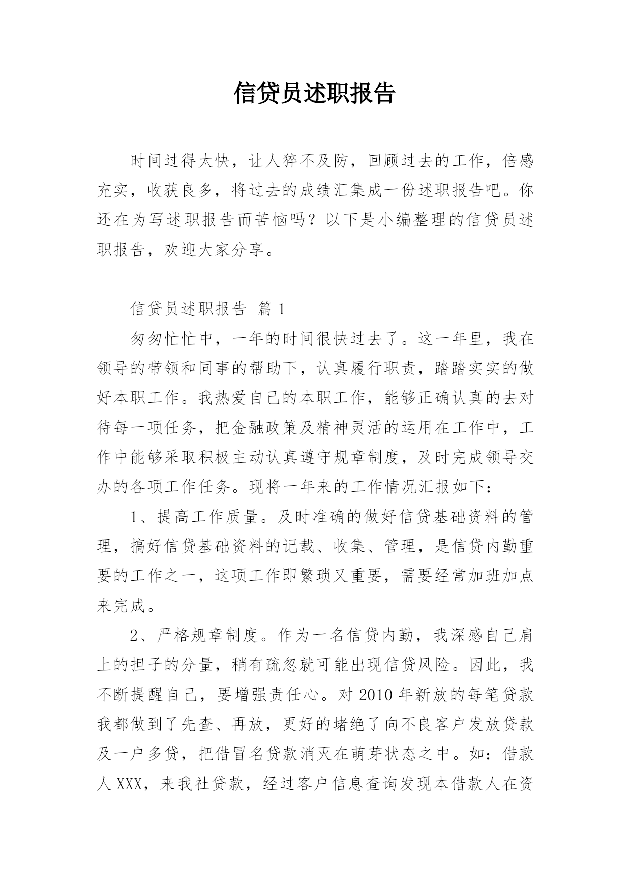 信贷员的述职报告信贷员的述职报告范文(精选3篇)时光在流逝,从不停歇;万物在更新,而我们在成长,回顾过去这段时间的工作,收获颇丰,好好准备一份述职报告吧。那么应当如何写述职报告呢?以下是小编为大家整理的信贷员的述职报告范文(精选3篇),欢迎大家分享。信贷员的述职报告1尊敬的领导,各位同事:大家好!匆匆忙忙中,一年的时间很快过去了。这一年里,我在领导的带领和同事的帮助下,认真履行职责,踏踏实实的做好本职工作。我热爱自己的本职工作,能够正确认真的去对待每一项任务,把金融政策及精神灵活的运用在工作中,工作中能够