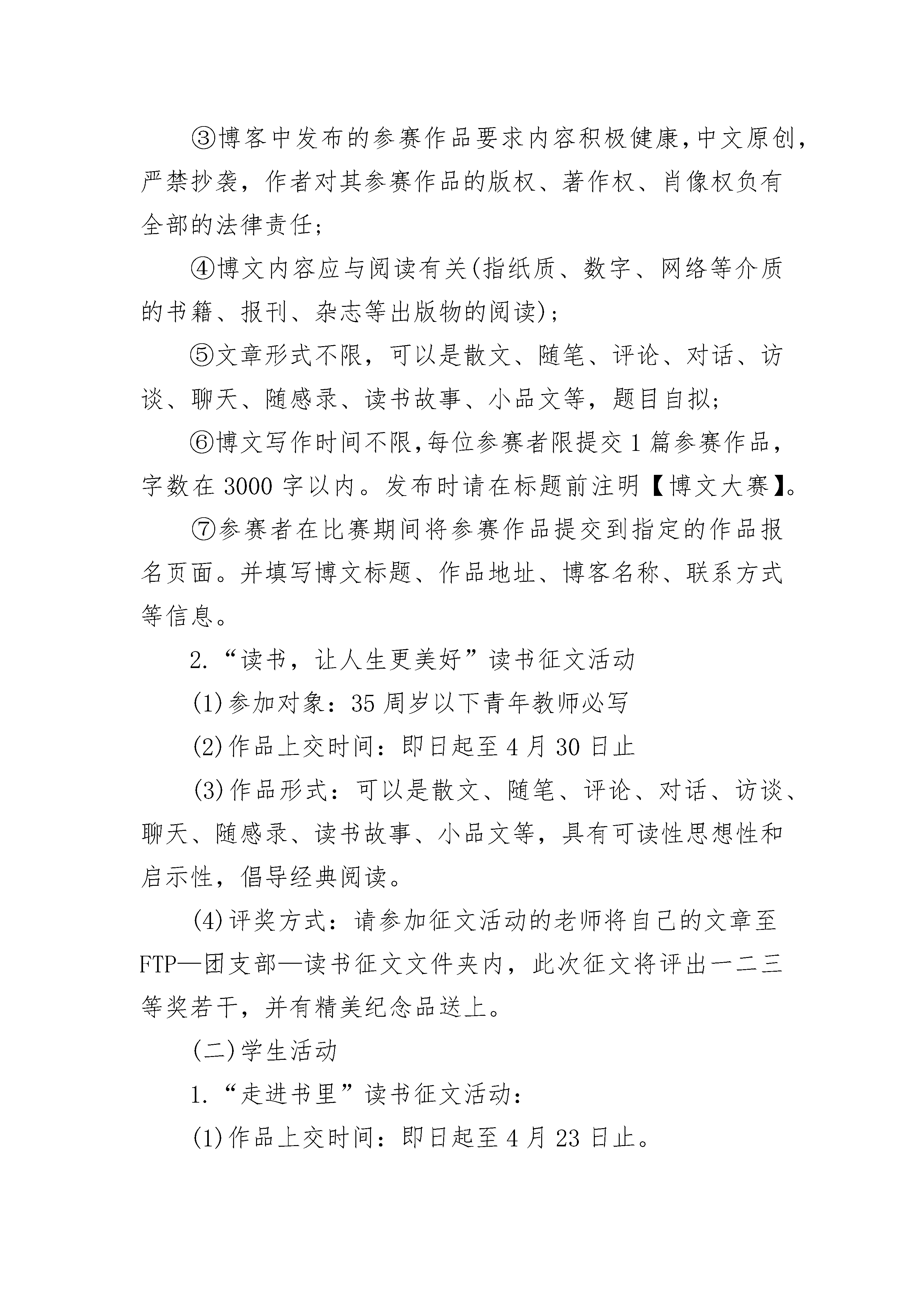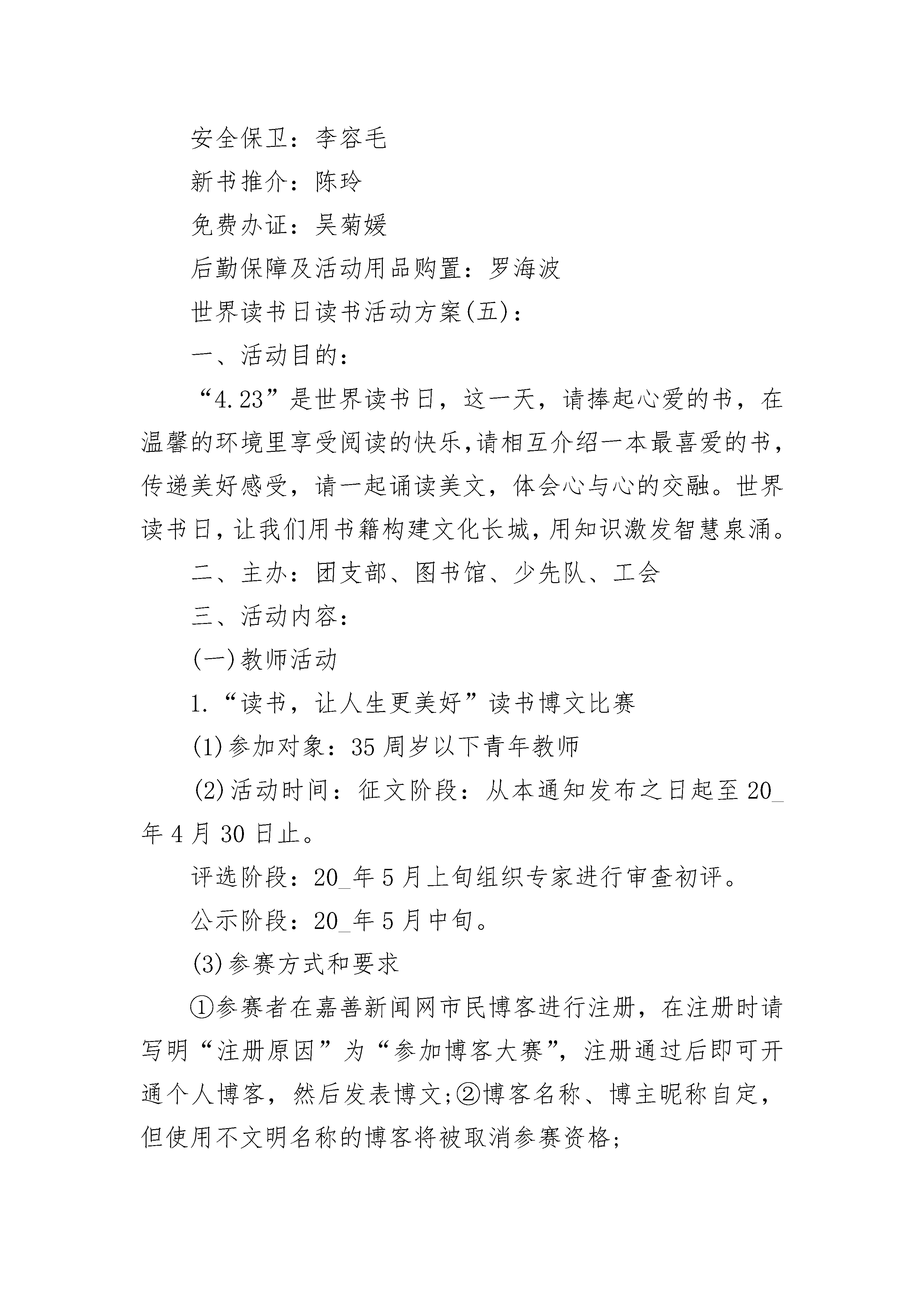 世界读书日活动方案最新世界读书日活动方案最新1一、指导思想深入实施素质教育,营造“科学减负、激情课堂、活力校园;德育为先、能力为重、全面发展”的和谐氛围,激发学生的学习探究兴趣与热情,让每一位学生享受读书的快乐。从而推动良好学习习惯的形成。二、活动主题让阅读成为习惯,让思考伴随人生阅读文化经典建设书香校园开展亲子阅读加强心灵沟通三、宣传口号1、活力校园,轻松学习,锻炼能力,展示自我。2、我读书、我快乐、我成长。3、大手拉小手共享读书乐。4、多读书,读好书,会读书。5、以读书为乐与智慧同行。6、与书籍为伍与