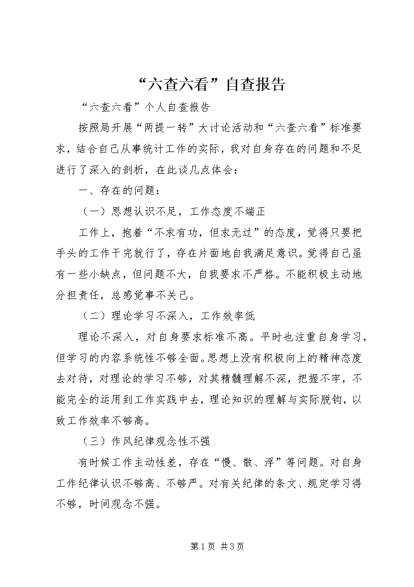 第PAGE\*Arabic\*MERGEFORMAT3页共NUMPAGES\*MERGEFORMAT3页“六查六看”自查报告“六查六看”个人自查报告按照局开展“两提一转”大讨论活动和“六查六看”标准要求,结合自己从事统计工作的实际,我对自身存在的问题和不足进行了深入的剖析,在此谈几点体会:一、存在的问题:(一)思想认识不足,工作态度不端正工作上,抱着“不求有功,但求无过”的态度,觉得只要把手头的工作干完就行了,存在片面地自我满足意识。觉得自己虽有一些小缺点,但问题不大,自我要求不严格。不能积极