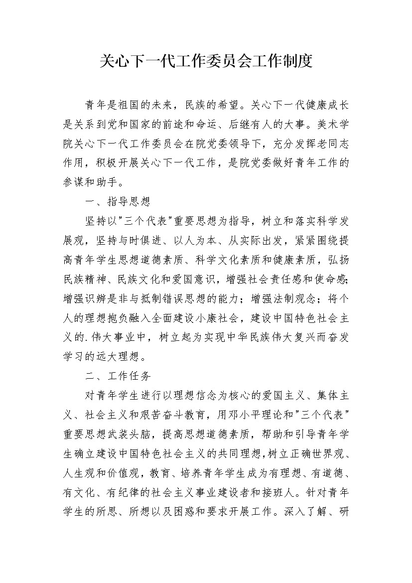 关心下一代工作委员会工作制度青年是祖国的未来民族的希望。关心下一代健康成长是关系到党和国家的前途和命运、后继有人的大事。美术学院关心下一代工作委员会在院党委领导下充分发挥老同志作用积极开展关心下一代工作是院党委做好青年工作的参谋和助手。一、指导思想坚持以"三个代表"重要思想为指导树立和落实科学发展观坚持与时俱进、以人为本、从实际出发紧紧围绕提高青年学生思想道德素质、科学文化素质和健康素质弘扬民族精神、民族文化和爱国意识增强社会责任感和使命感;增强识辨是非与抵制错误