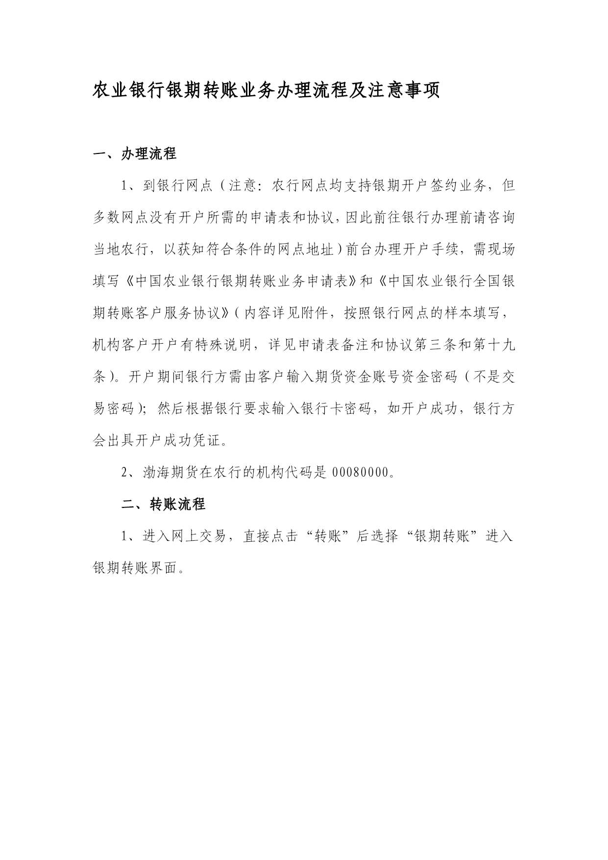农业银行银期转账业务办理流程及注意事项一、办理流程1、到银行网点(注意:农行网点均支持银期开户签约业务,但多数网点没有开户所需的申请表和协议,因此前往银行办理前请咨询当地农行,以获知符合条件的网点地址)前台办理开户手续,需现场填写《中国农业银行银期转账业务申请表》和《中国农业银行全国银期转账客户服务协议》(内容详见附件,按照银行网点的样本填写,机构客户开户有特殊说明,详见申请表备注和协议第三条和第十九条)。开户期间银行方需由客户输入期货资金账号资金密码(不是交易密码);然后根据银行要求输入银行卡密码,如开