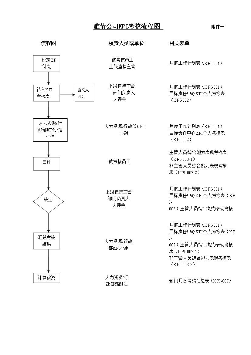 雅倩公司KPI考核流程图附件一月度工作计划表(KPI-001)目标责任中心KPI个人考核表(KPI-002)人力资源/行政部KPI小组存档人力资源/行政部KPI小组上级直接主管部门负责人人评会被考核员工被考核员工上级直接主管上级直接主管部门负责人人评会人力资源/行政部KPI小组人力资源/行政部薪酬处权责人员或单位流程图提交人评会核定转入KPI考核表自评设定KPI计划计算薪资汇总考核结果主管人员综合能力表现考核表(KPI-003-1)非主管人员综合能力表现考核表(KPI-003-2)相关表单部门月份考绩汇总