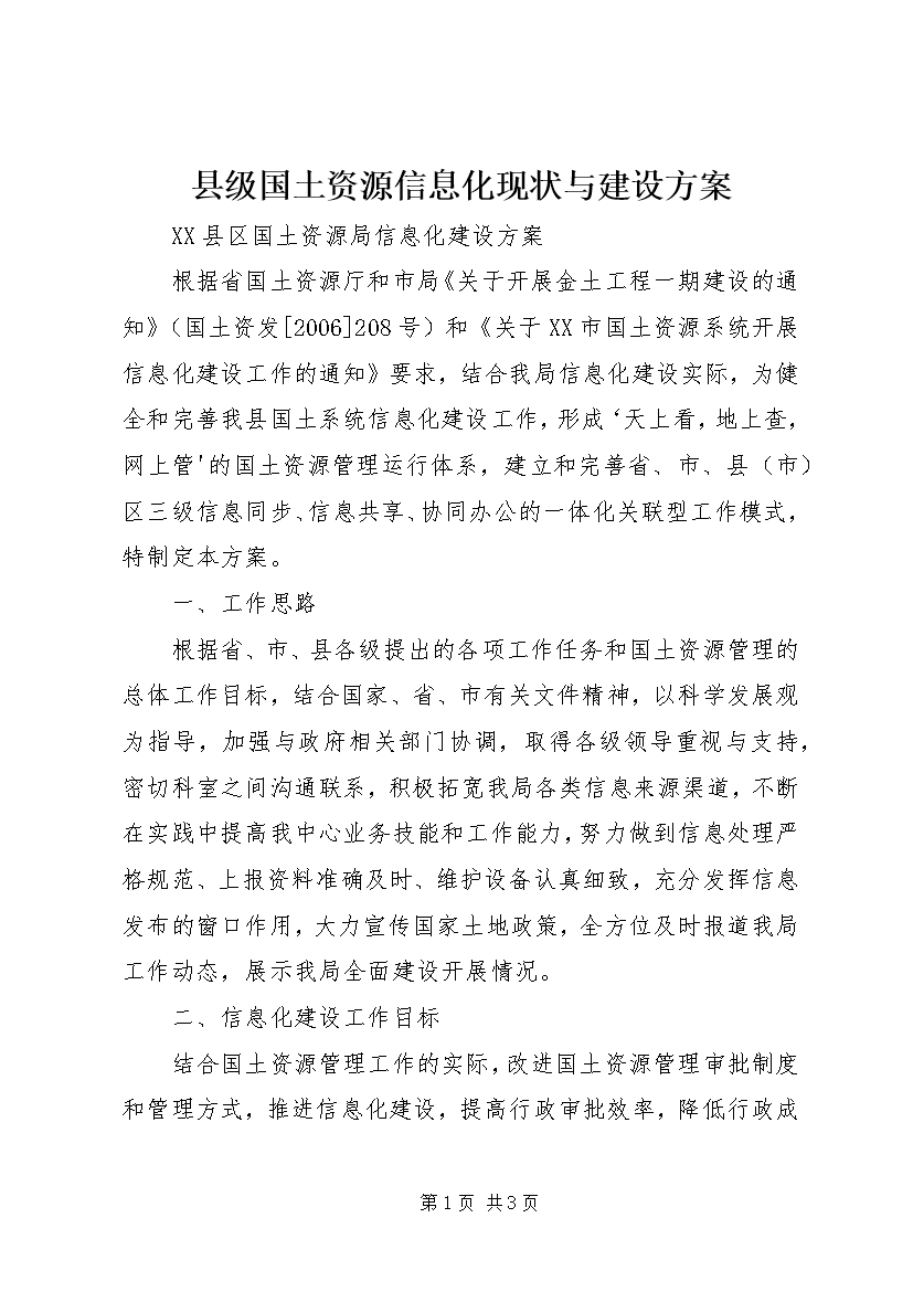 县级国土资源信息化现状与建设方案XX县区国土资源局信息化建设方案根据省国土资源厅和市局《关于开展金土工程一期建设的通知》(国土资发[2006]208号)和《关于XX市国土资源系统开展信息化建设工作的通知》要求,结合我局信息化建设实际,为健全和完善我县国土系统信息化建设工作,形成‘天上看,地上查,网上管'的国土资源管理运行体系,建立和完善省、市、县(市)区三级信息同步、信息共享、协同办公的一体化关联型工作模式,特制定本方案。一、工作思路根据省、市、县各级提出的各项工作任务和国土资源管理的总体工作目标,结合国