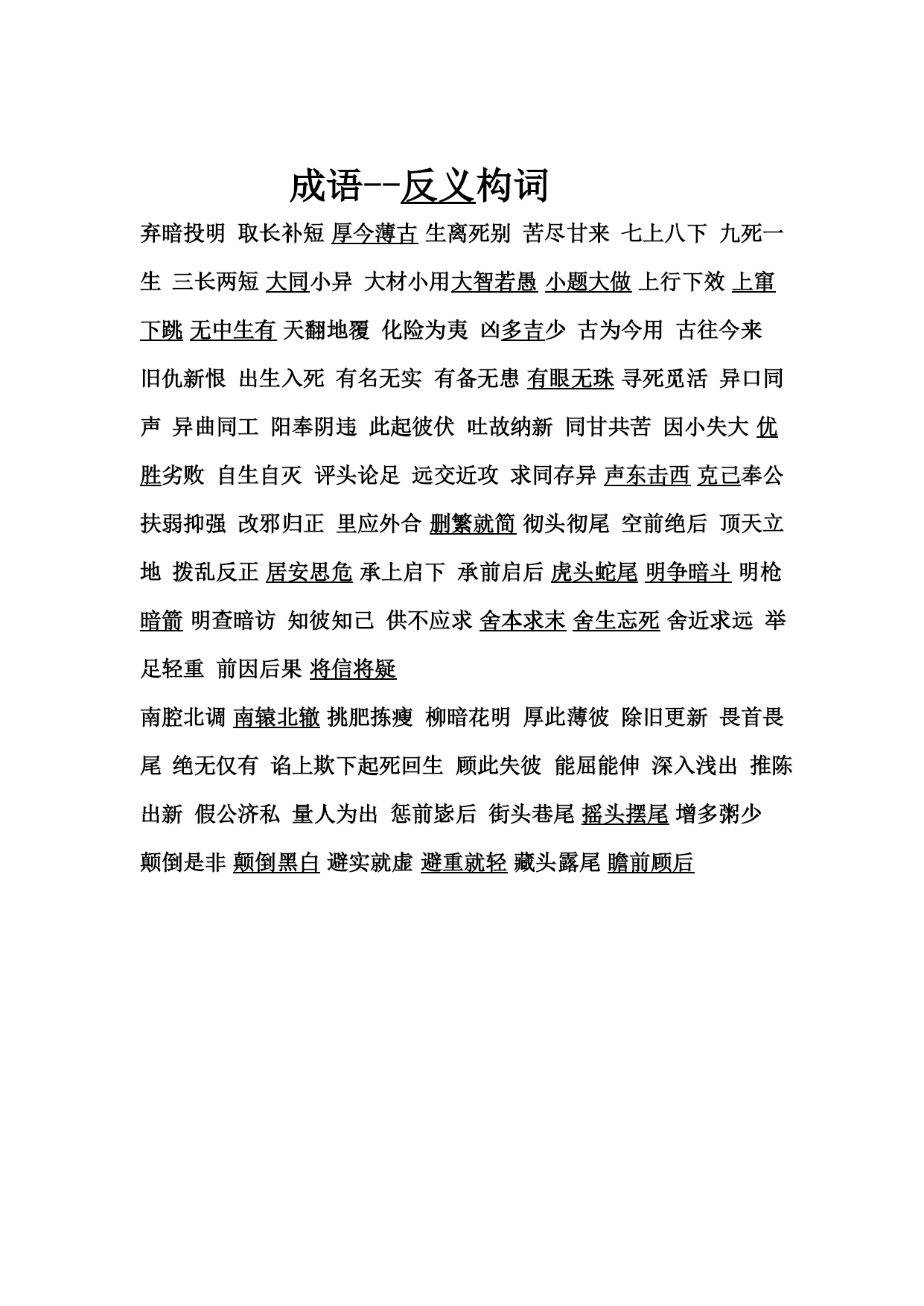 成语--HYPERLINK"http://wenwen.sogou.com/s/?w=%E5%8F%8D%E4%B9%89&ch=w.search.intlink"\t"_blank"反义构词弃暗投明取长补短HYPERLINK"http://wenwen.sogou.com/s/?w=%E5%8E%9A%E4%BB%8A%E8%96%84%E5%8F%A4&ch=w.search.intlink"\t"_blank"厚今薄古生离死别苦尽甘来七上八下九死一生三长两短HYPERLINK"http