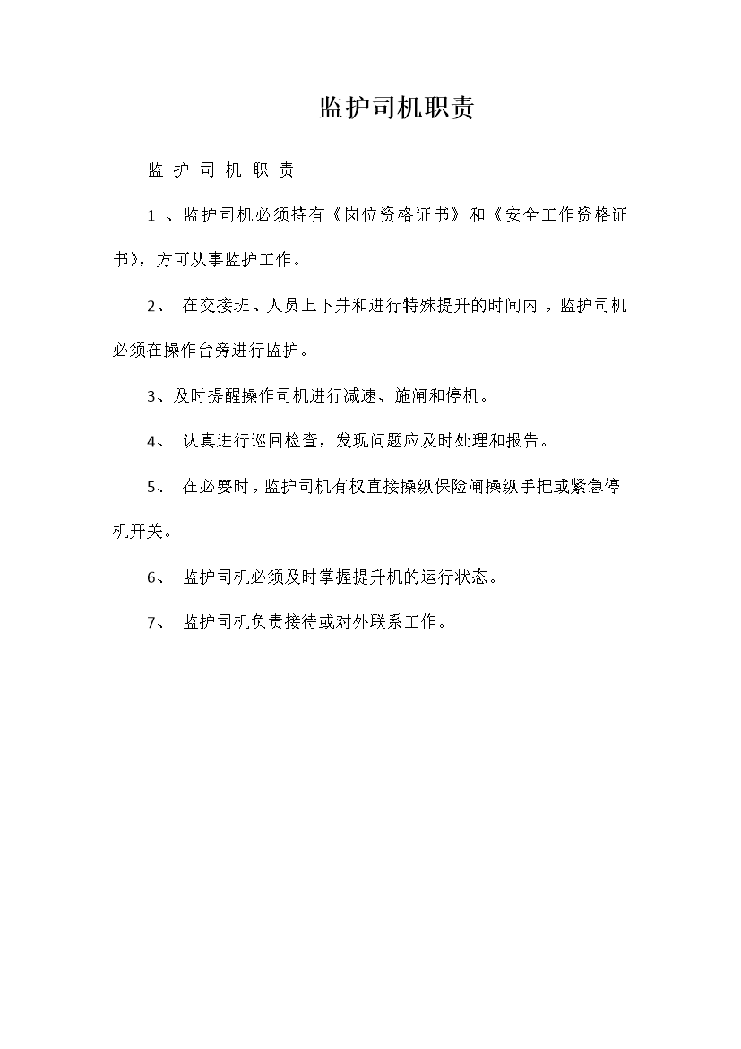 监护司机职责监护司机职责1、监护司机必须持有《岗位资格证书》和《安全工作资格证书》方可从事监护工作。2、在交接班、人员上下井和进行特殊提升的时间内监护司机必须在操作台旁进行监护。3、及时提醒操作司机进行减速、施闸和停机。4、认真进行巡回检查发现问题应及时处理和报告。5、在必要时监护司机有权直接操纵保险闸操纵手把或紧急停机开关。6、监护司机必须及时掌握提升机的运行状态。7、监护司机负责接待或对外联系工作。