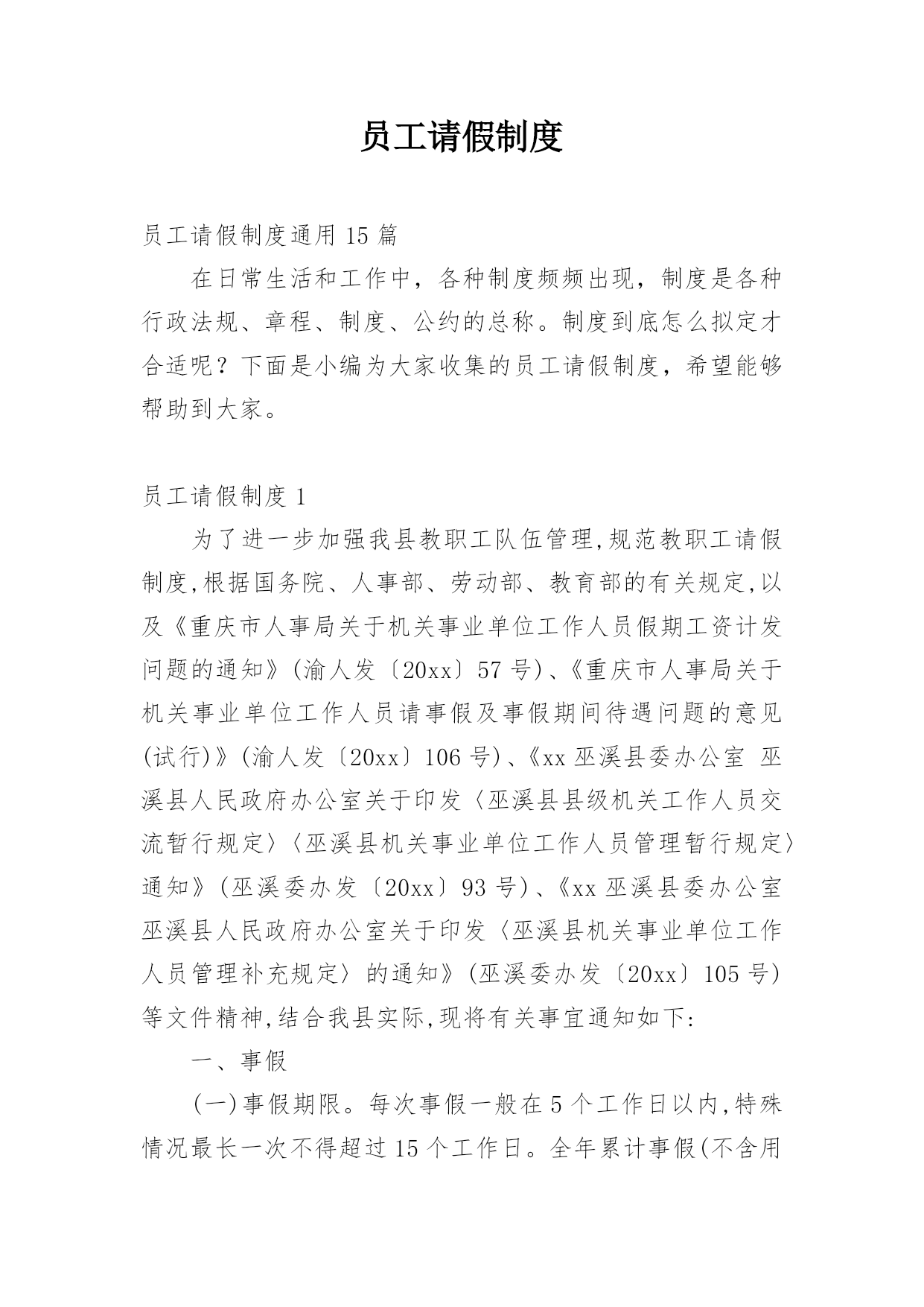 员工请假制度员工请假制度通用15篇在日常生活和工作中,各种制度频频出现,制度是各种行政法规、章程、制度、公约的总称。制度到底怎么拟定才合适呢?下面是小编为大家收集的员工请假制度,希望能够帮助到大家。员工请假制度1为了进一步加强我县教职工队伍管理,规范教职工请假制度,根据国务院、人事部、劳动部、教育部的有关规定,以及《重庆市人事局关于机关事业单位工作人员假期工资计发问题的通知》(渝人发〔20xx〕57号)、《重庆市人事局关于机关事业单位工作人员请事假及事假期间待遇问题的意见(试行)》(渝人发〔20xx〕10