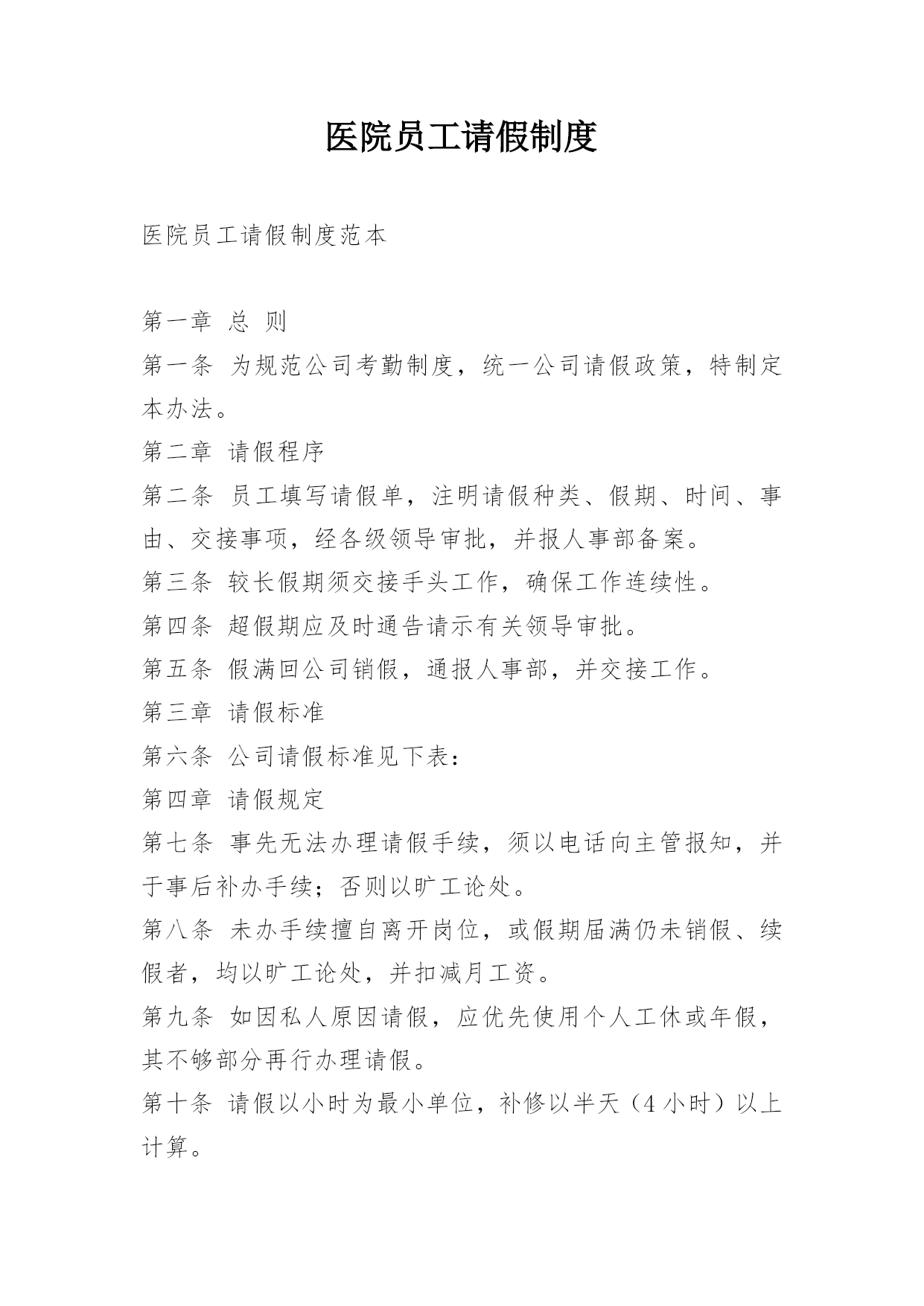 医院员工请假制度医院员工请假制度范本第一章总则第一条为规范公司考勤制度,统一公司请假政策,特制定本办法。第二章请假程序第二条员工填写请假单,注明请假种类、假期、时间、事由、交接事项,经各级领导审批,并报人事部备案。第三条较长假期须交接手头工作,确保工作连续性。第四条超假期应及时通告请示有关领导审批。第五条假满回公司销假,通报人事部,并交接工作。第三章请假标准第六条公司请假标准见下表:第四章请假规定第七条事先无法办理请假手续,须以电话向主管报知,并于事后补办手续;否则以旷工论处。第八条未办手续擅自离开岗位,