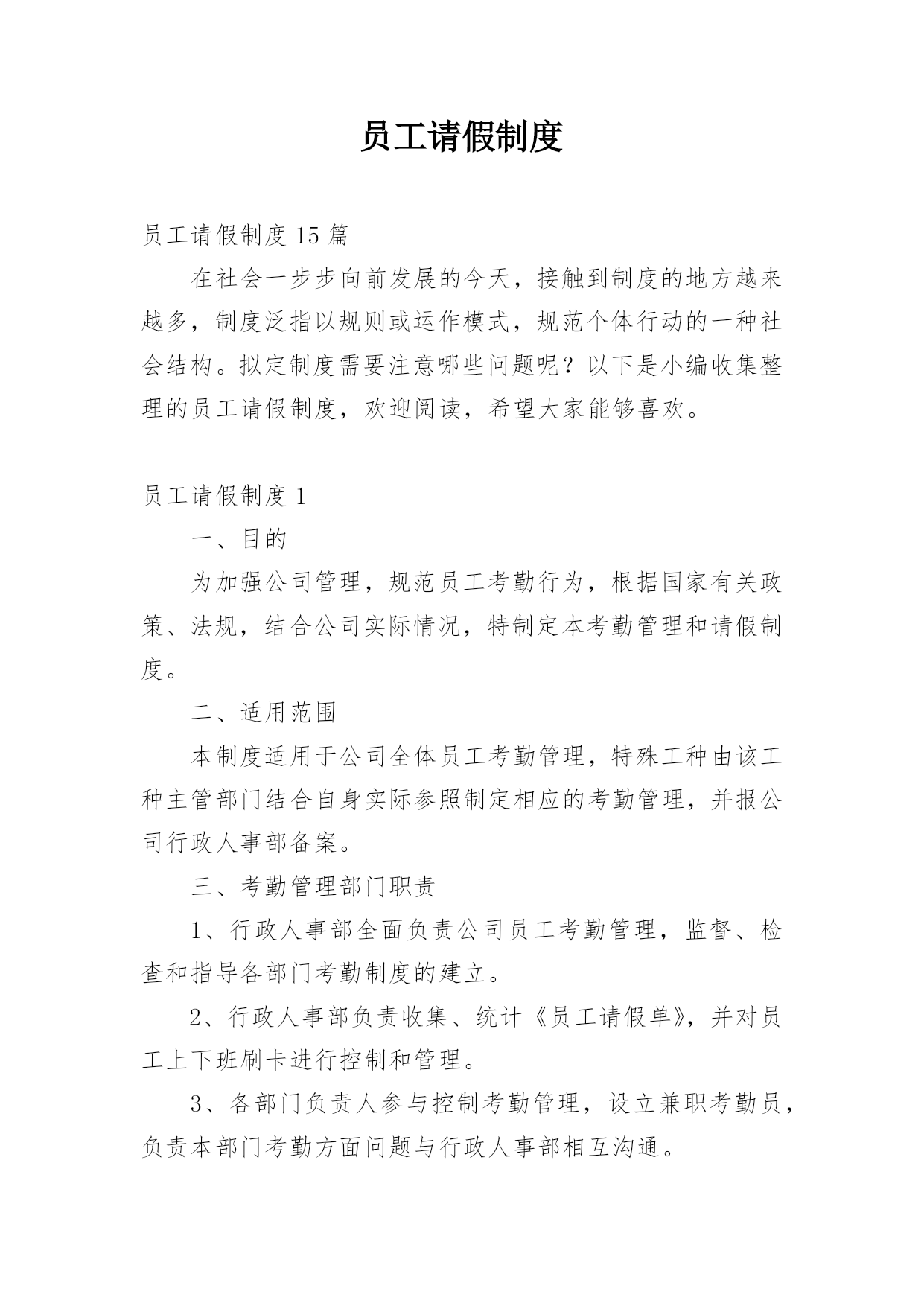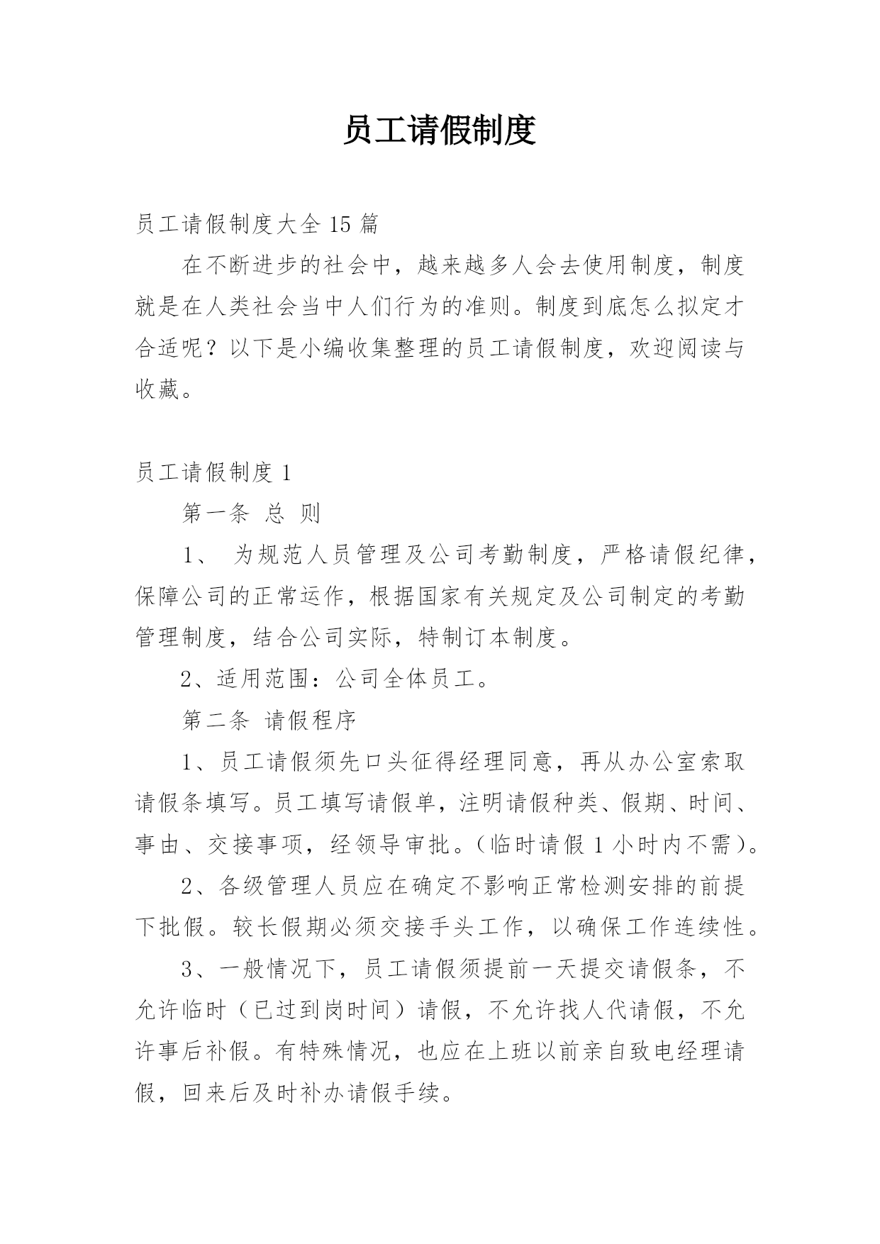 员工请假制度员工请假制度大全15篇在不断进步的社会中,越来越多人会去使用制度,制度就是在人类社会当中人们行为的准则。制度到底怎么拟定才合适呢?以下是小编收集整理的员工请假制度,欢迎阅读与收藏。员工请假制度1第一条总则1、为规范人员管理及公司考勤制度,严格请假纪律,保障公司的正常运作,根据国家有关规定及公司制定的考勤管理制度,结合公司实际,特制订本制度。2、适用范围:公司全体员工。第二条请假程序1、员工请假须先口头征得经理同意,再从办公室索取请假条填写。员工填写请假单,注明请假种类、假期、时间、事由、交接事