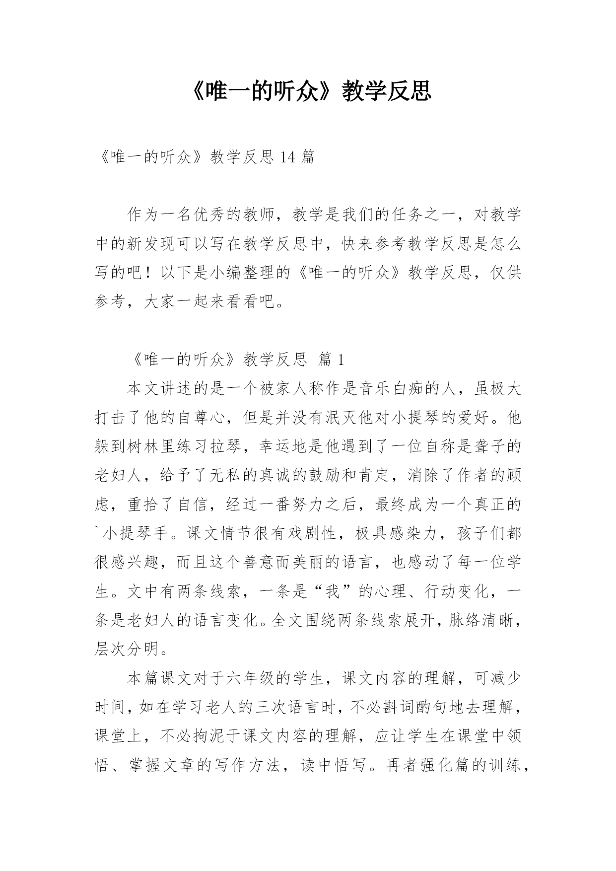 《唯一的听众》教学反思《唯一的听众》教学反思14篇作为一名优秀的教师,教学是我们的任务之一,对教学中的新发现可以写在教学反思中,快来参考教学反思是怎么写的吧!以下是小编整理的《唯一的听众》教学反思,仅供参考,大家一起来看看吧。《唯一的听众》教学反思篇1本文讲述的是一个被家人称作是音乐白痴的人,虽极大打击了他的自尊心,但是并没有泯灭他对小提琴的爱好。他躲到树林里练习拉琴,幸运地是他遇到了一位自称是聋子的老妇人,给予了无私的真诚的鼓励和肯定,消除了作者的顾虑,重拾了自信,经过一番努力之后,最终成为一个真正的`