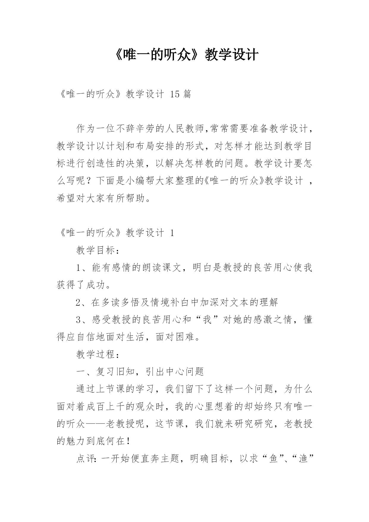 《唯一的听众》教学设计《唯一的听众》教学设计15篇作为一位不辞辛劳的人民教师,常常需要准备教学设计,教学设计以计划和布局安排的形式,对怎样才能达到教学目标进行创造性的决策,以解决怎样教的问题。教学设计要怎么写呢?下面是小编帮大家整理的《唯一的听众》教学设计,希望对大家有所帮助。《唯一的听众》教学设计1教学目标:1、能有感情的朗读课文,明白是教授的良苦用心使我获得了成功。2、在多读多悟及情境补白中加深对文本的理解3、感受教授的良苦用心和“我”对她的感激之情,懂得应自信地面对生活,面对困难。教学过程:一、复习