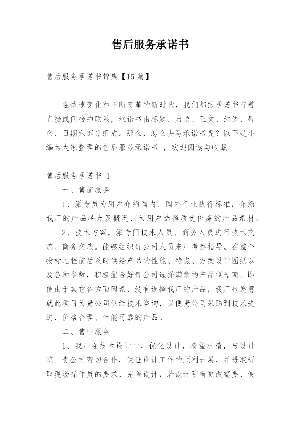 售后服务承诺书售后服务承诺书范文在日新月异的现代社会中,能够利用到承诺书的场合越来越多,承诺书如经合同认可,可以作为合同的一部分一同履行。在写之前,可以先参考范文,下面是小编帮大家整理的售后服务承诺书范文,欢迎大家借鉴与参考,希望对大家有所帮助。售后服务承诺书范文1我公司为保证在施工完成后达到建设单位对本工程的质量、工程回访、保修等方面的要求,最大限度的满足建设单位的要求,我公司就本工程质量保修向建设单位做出如下承诺:1保修期内的售后服务1.1保修服务范围1)保修的内容按建设部《建设工程质量管理条例》及《