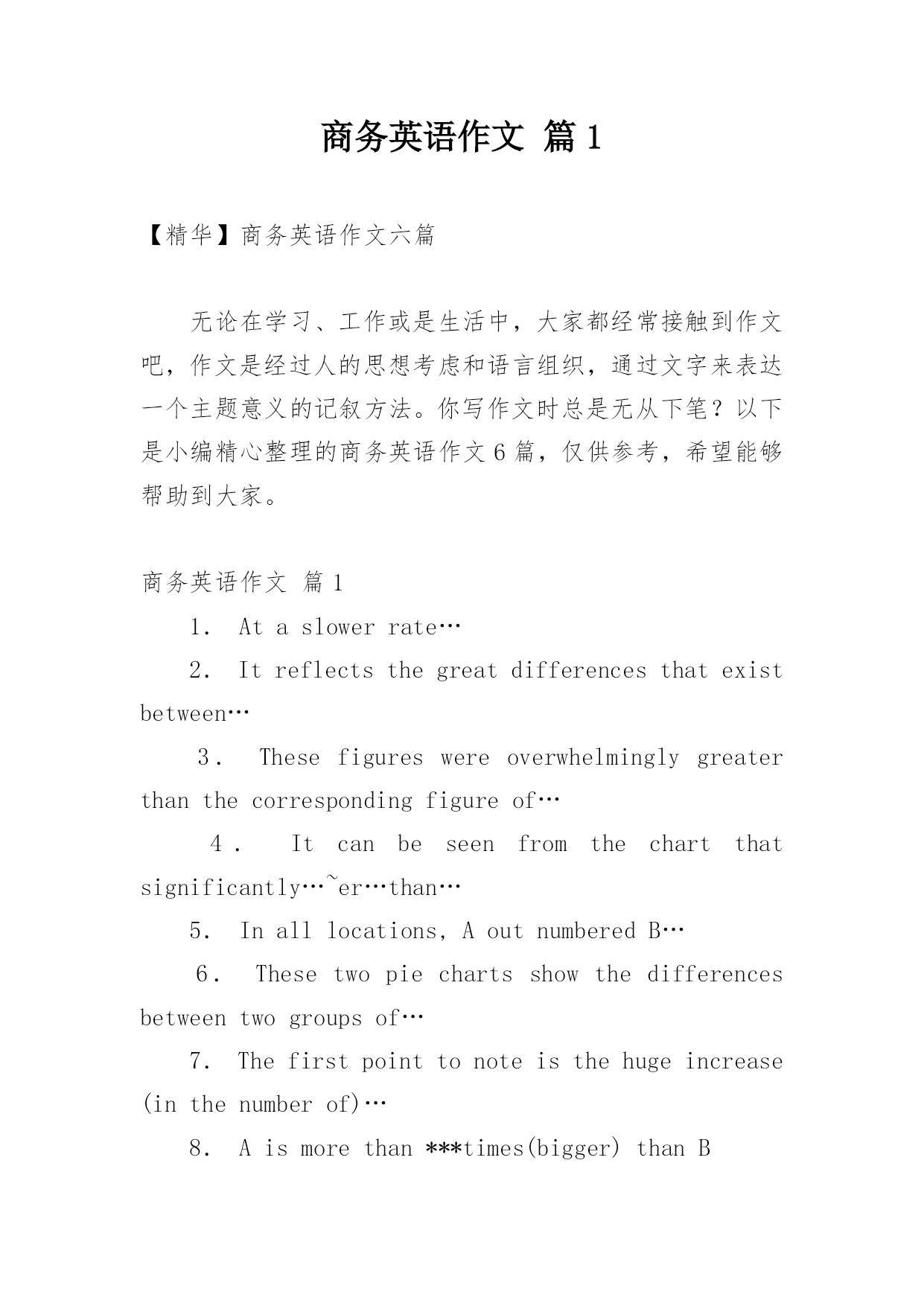 商务英语作文篇1【精华】商务英语作文六篇无论在学习、工作或是生活中,大家都经常接触到作文吧,作文是经过人的思想考虑和语言组织,通过文字来表达一个主题意义的记叙方法。你写作文时总是无从下笔?以下是小编精心整理的商务英语作文6篇,仅供参考,希望能够帮助到大家。商务英语作文篇11.Ataslowerrate…2.Itreflectsthegreatdifferencesthatexistbetween…3.Thesefigureswereoverwhelminglygreaterthanthecorrespon