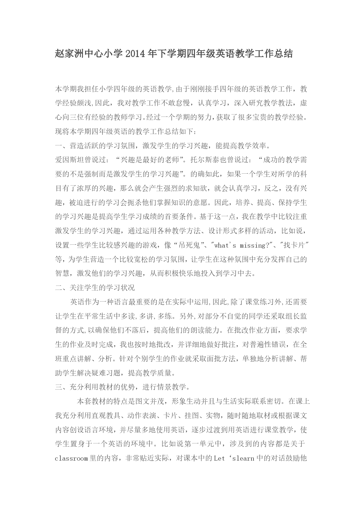 赵家洲中心小学2014年下学期四年级英语教学工作总结本学期我担任小学四年级的英语教学,由于刚刚接手四年级的英语教学工作,教学经验颇浅,因此,我对教学工作不敢怠慢,认真学习,深入研究教学教法,虚心向三位有经验的教师学习。经过一个学期的努力,获取了很多宝贵的教学经验。现将本学期四年级英语的教学工作总结如下:一、营造活跃的学习氛围,激发学生的学习兴趣,能提高教学效率。爱因斯坦曾说过:“兴趣是最好的老师”。托尔斯泰也曾说过:“成功的教学需要的不是强制而是激发学生的学习兴趣”。的确如此,如果一个学生对所学的科目有了