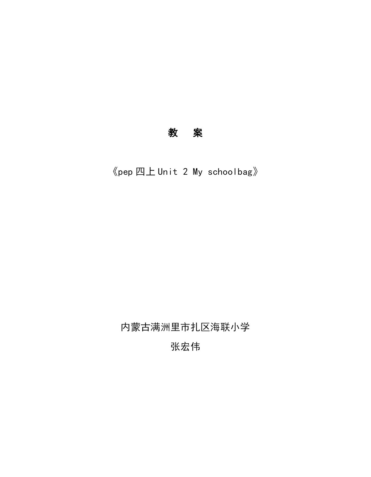教案《pep四上Unit2Myschoolbag》内蒙古满洲里市扎区海联小学张宏伟课题:Unit2Myschoolbag(4)教学目标:知识目标:能听懂会说21-50的数字。能力目标:能用50以内的数字回答Howmany...canyousee?Howmany...doyouhave?情感目标:使学生学会观察,善于发现教学重点:1.句型:Howmany…doyouhave?Howmany…canyousee?2.词汇:twenty-one…fifty教学难点:发音:thirteen与thirty,four