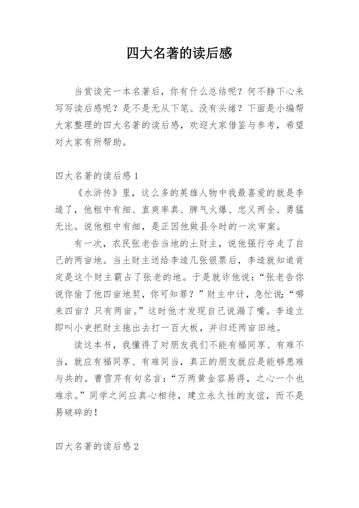 四大名著的读后感当赏读完一本名著后,你有什么总结呢?何不静下心来写写读后感呢?是不是无从下笔、没有头绪?下面是小编帮大家整理的四大名著的读后感,欢迎大家借鉴与参考,希望对大家有所帮助。四大名著的读后感1《水浒传》里,这么多的英雄人物中我最喜爱的就是李逵了,他粗中有细、直爽率真、脾气火爆、忠义两全、勇猛无比。说他粗中有细,是正因他做县令时的一次审案。有一次,农民张老告当地的土财主,说他强行夺走了自己的两亩地。当土财主送给李逵几张银票后,李逵就知道肯定是这个财主霸占了张老的地。于是就诈他说:“张老告你说你偷了
