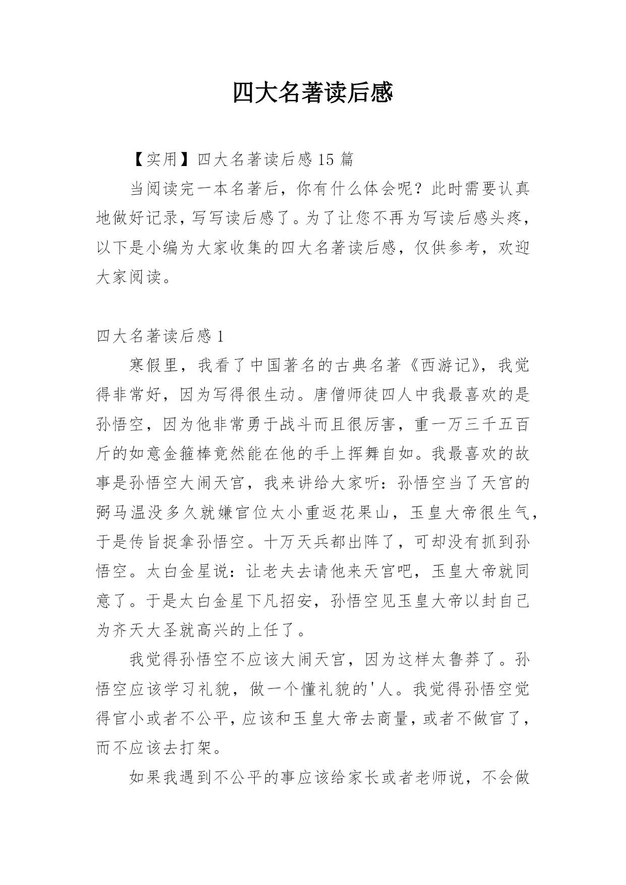 四大名著读后感【实用】四大名著读后感15篇当阅读完一本名著后,你有什么体会呢?此时需要认真地做好记录,写写读后感了。为了让您不再为写读后感头疼,以下是小编为大家收集的四大名著读后感,仅供参考,欢迎大家阅读。四大名著读后感1寒假里,我看了中国著名的古典名著《西游记》,我觉得非常好,因为写得很生动。唐僧师徒四人中我最喜欢的是孙悟空,因为他非常勇于战斗而且很厉害,重一万三千五百斤的如意金箍棒竟然能在他的手上挥舞自如。我最喜欢的故事是孙悟空大闹天宫,我来讲给大家听:孙悟空当了天宫的弼马温没多久就嫌官位太小重返花果
