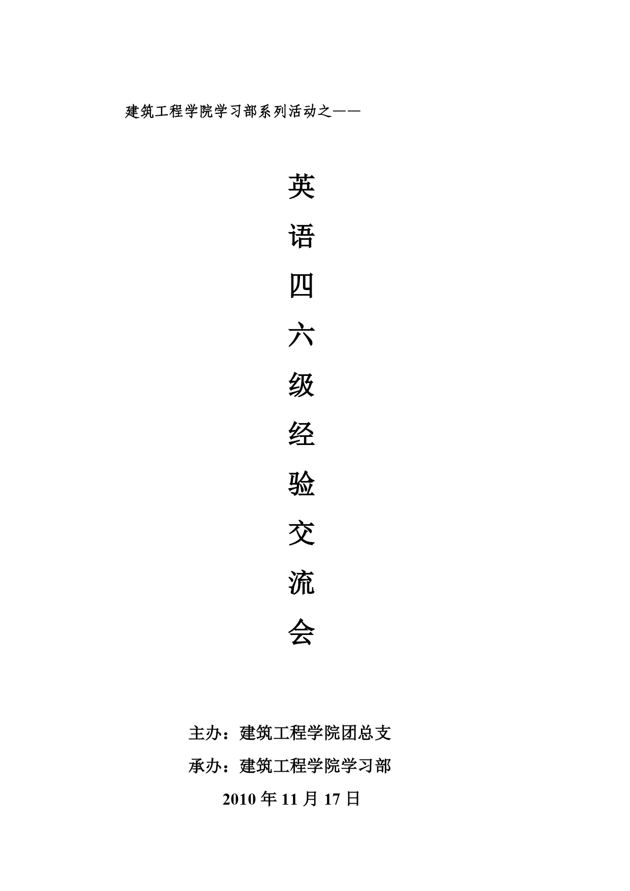 建筑工程学院学习部系列活动之——英语四六级经验交流会主办:建筑工程学院团总支承办:建筑工程学院学习部2010年11月17日英语四六级经验交流会----活动总结11月16日晚7点建筑工程学院在B101举行了“英语四六级经验交流会”。英语四、六级考试一直是一个令广大同学头疼的问题,因此我们学院特举办了此次英语四、六级考试经验交流会。我们很荣幸的邀请到了具有多年教学经验的外国语学院的老师进行了指导,同时邀请了08级英语四、六级成绩优秀学生介绍自己的备考战略。举办此次活动诣在提高同学们的四六级通过率,帮助同学们解
