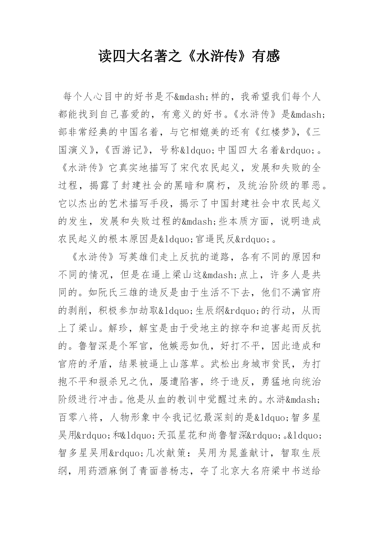 读四大名著之《水浒传》有感每个人心目中的好书是不—样的,我希望我们每个人都能找到自己喜爱的,有意义的好书。《水浒传》是—部非常经典的中国名着,与它相媲美的还有《红楼梦》,《三国演义》,《西游记》,号称“中国四大名着”。《水浒传》它真实地描写了宋代农民起义,发展和失败的全过程,揭露了封建社会的黑暗和腐朽,及统治阶级的罪恶。它以杰出的艺术描写手段,揭示了中国封建社会中农民起义的发生,发展和失败过程的—些本质方面,说明造成农民起义的根本原因是&ldqu
