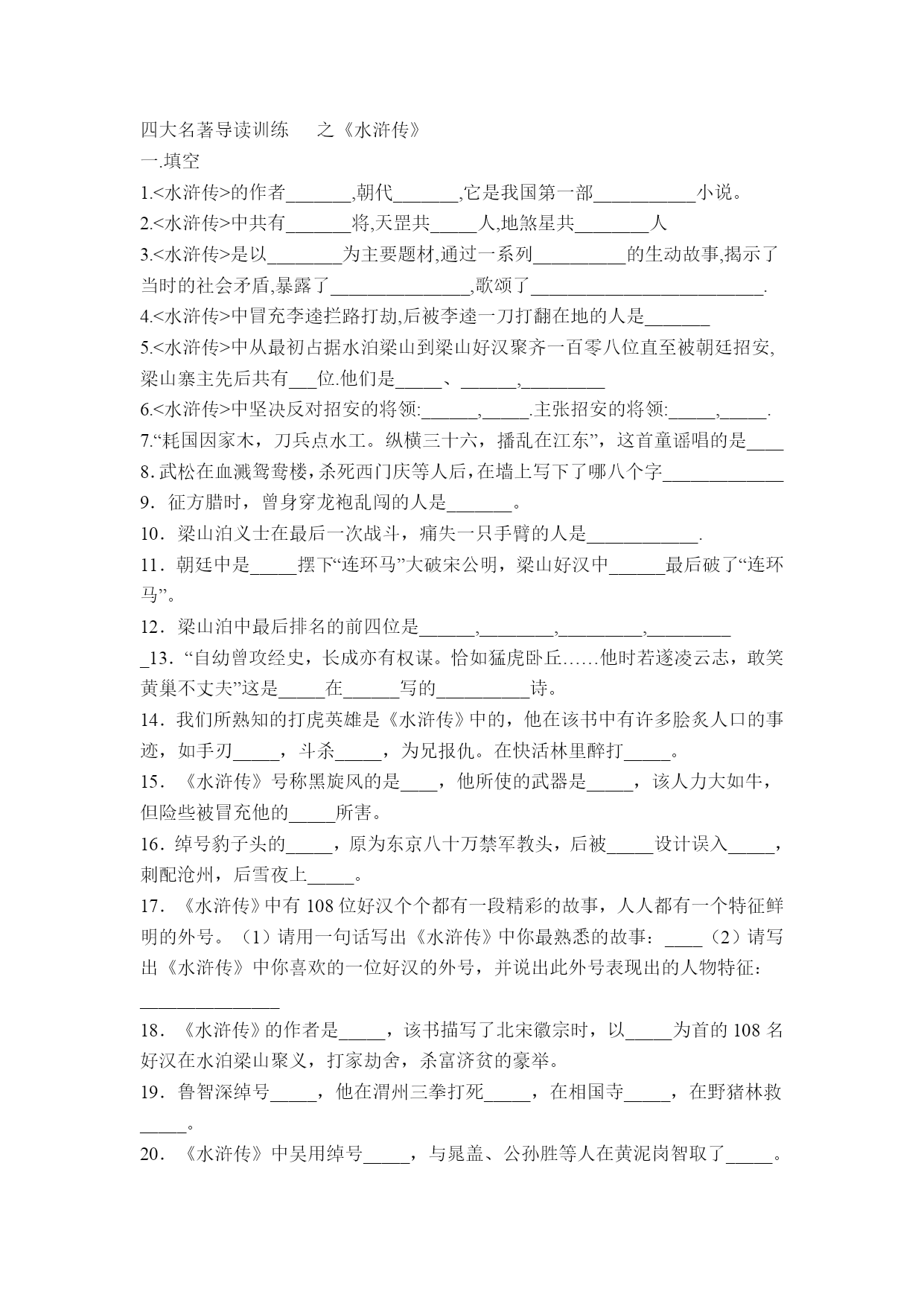 四大名著导读训练之《水浒传》一.填空1.<水浒传>的作者_______,朝代_______,它是我国第一部___________小说。2.<水浒传>中共有_______将,天罡共_____人,地煞星共________人3.<水浒传>是以________为主要题材,通过一系列__________的生动故事,揭示了当时的社会矛盾,暴露了_______________,歌颂了_________________________.4.<水浒传>中冒充李逵拦路打劫,后被李逵一刀打翻在地的人是_______5.<水浒传