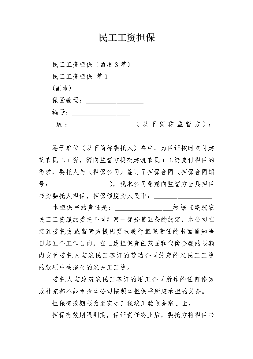 民工工资担保民工工资担保(通用3篇)民工工资担保篇1(副本)保函编码:_________________编号:_________________致:_________________(以下简称监管方):_________________鉴于单位(以下简称委托人)在中,为保证按时支付建筑农民工工资,需向监管方提交建筑农民工工资支付担保的需求,委托人与(担保公司)签订了担保合同(担保合同编号:_________________),现本公司愿意向监管方出具担保书为委托人担保,担保额度为人民币:_______