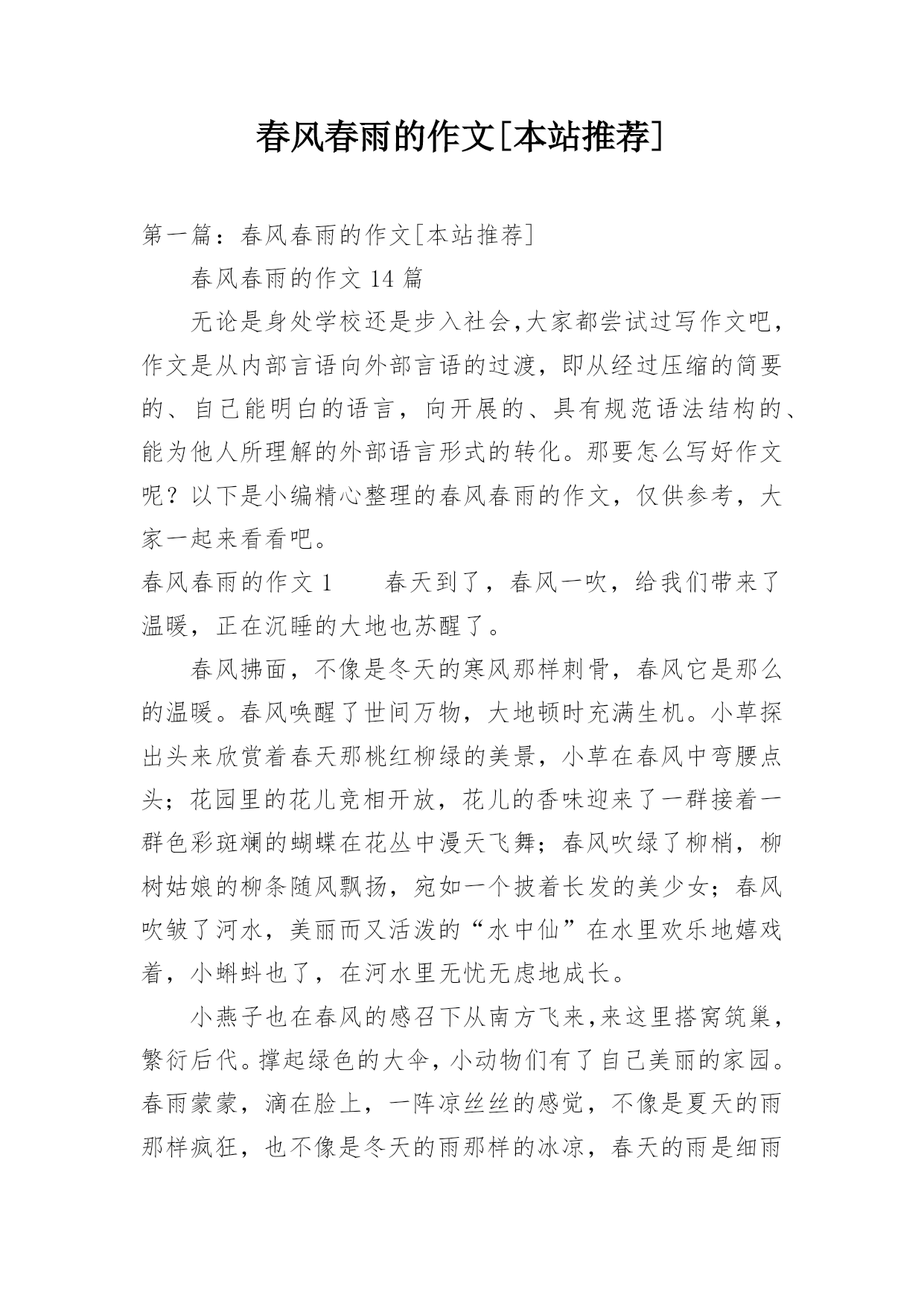 春风春雨的作文[本站推荐]第一篇:春风春雨的作文[本站推荐]春风春雨的作文14篇无论是身处学校还是步入社会,大家都尝试过写作文吧,作文是从内部言语向外部言语的过渡,即从经过压缩的简要的、自己能明白的语言,向开展的、具有规范语法结构的、能为他人所理解的外部语言形式的转化。那要怎么写好作文呢?以下是小编精心整理的春风春雨的作文,仅供参考,大家一起来看看吧。春风春雨的作文1春天到了,春风一吹,给我们带来了温暖,正在沉睡的大地也苏醒了。春风拂面,不像是冬天的寒风那样刺骨,春风它是那么的温暖。春风唤醒了世间万物,大