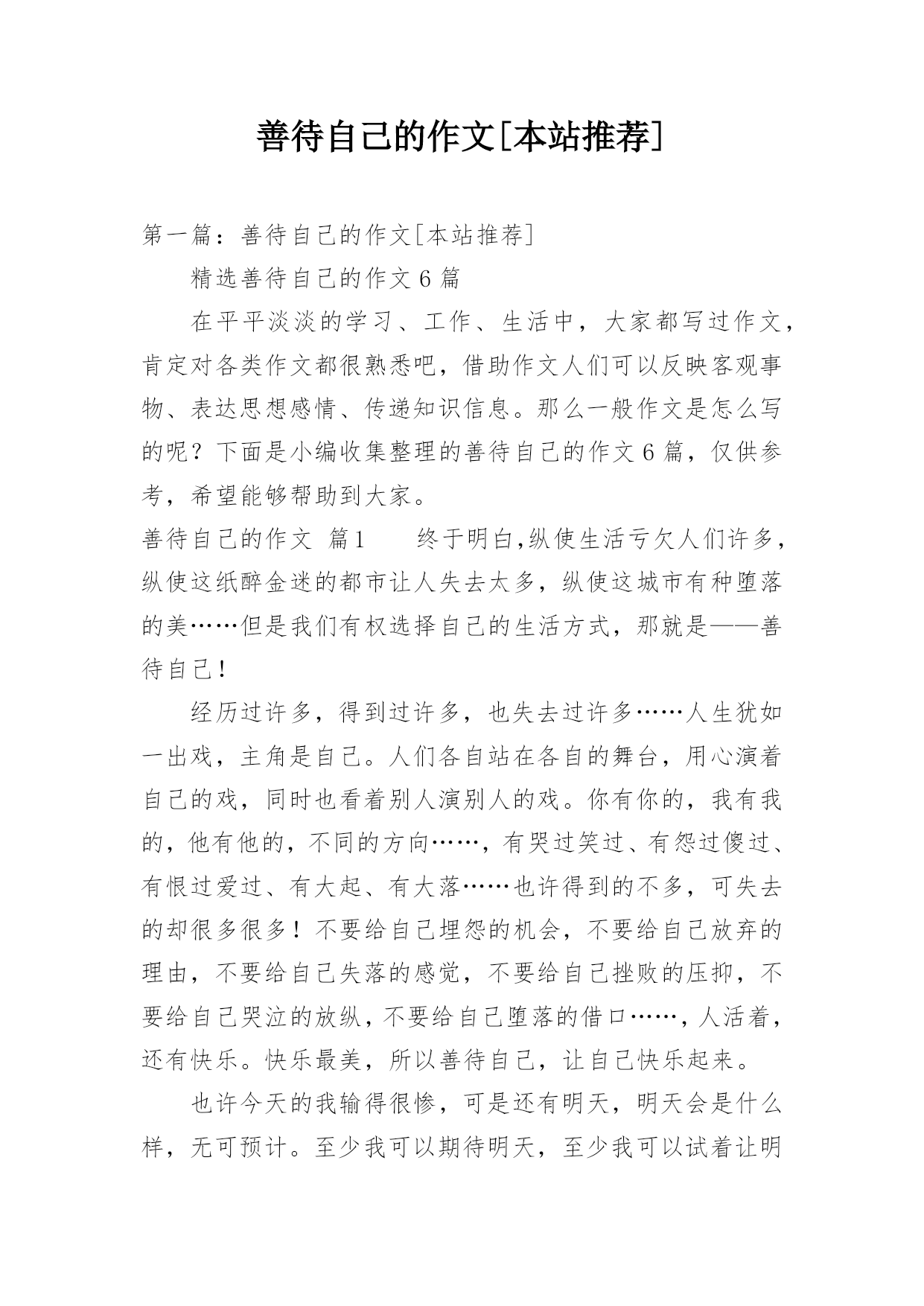 善待自己的作文[本站推荐]第一篇:善待自己的作文[本站推荐]精选善待自己的作文6篇在平平淡淡的学习、工作、生活中,大家都写过作文,肯定对各类作文都很熟悉吧,借助作文人们可以反映客观事物、表达思想感情、传递知识信息。那么一般作文是怎么写的呢?下面是小编收集整理的善待自己的作文6篇,仅供参考,希望能够帮助到大家。善待自己的作文篇1终于明白,纵使生活亏欠人们许多,纵使这纸醉金迷的都市让人失去太多,纵使这城市有种堕落的美……但是我们有权选择自己的生活方式,那就是——善待自己!经历过许多,得到过许多,也失去过许多…