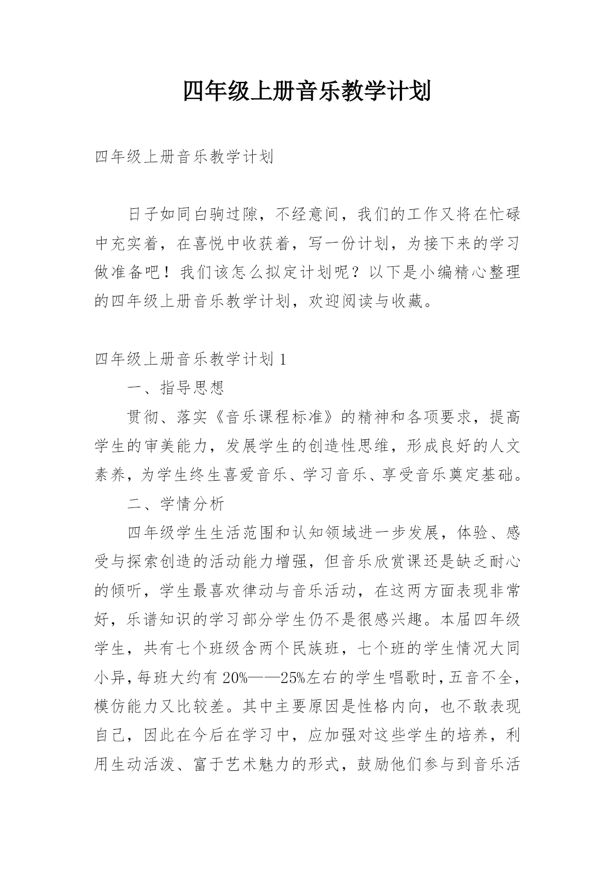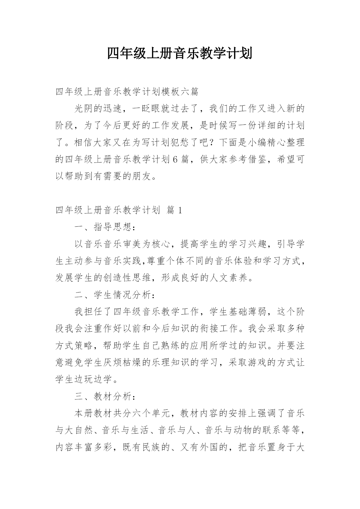 四年级上册音乐教学计划四年级上册音乐教学计划模板六篇光阴的迅速,一眨眼就过去了,我们的工作又进入新的阶段,为了今后更好的工作发展,是时候写一份详细的计划了。相信大家又在为写计划犯愁了吧?下面是小编精心整理的四年级上册音乐教学计划6篇,供大家参考借鉴,希望可以帮助到有需要的朋友。四年级上册音乐教学计划篇1一、指导思想:以音乐音乐审美为核心,提高学生的学习兴趣,引导学生主动参与音乐实践,尊重个体不同的音乐体验和学习方式,发展学生的创造性思维,形成良好的人文素养。二、学生情况分析:我担任了四年级音乐教学工作,学