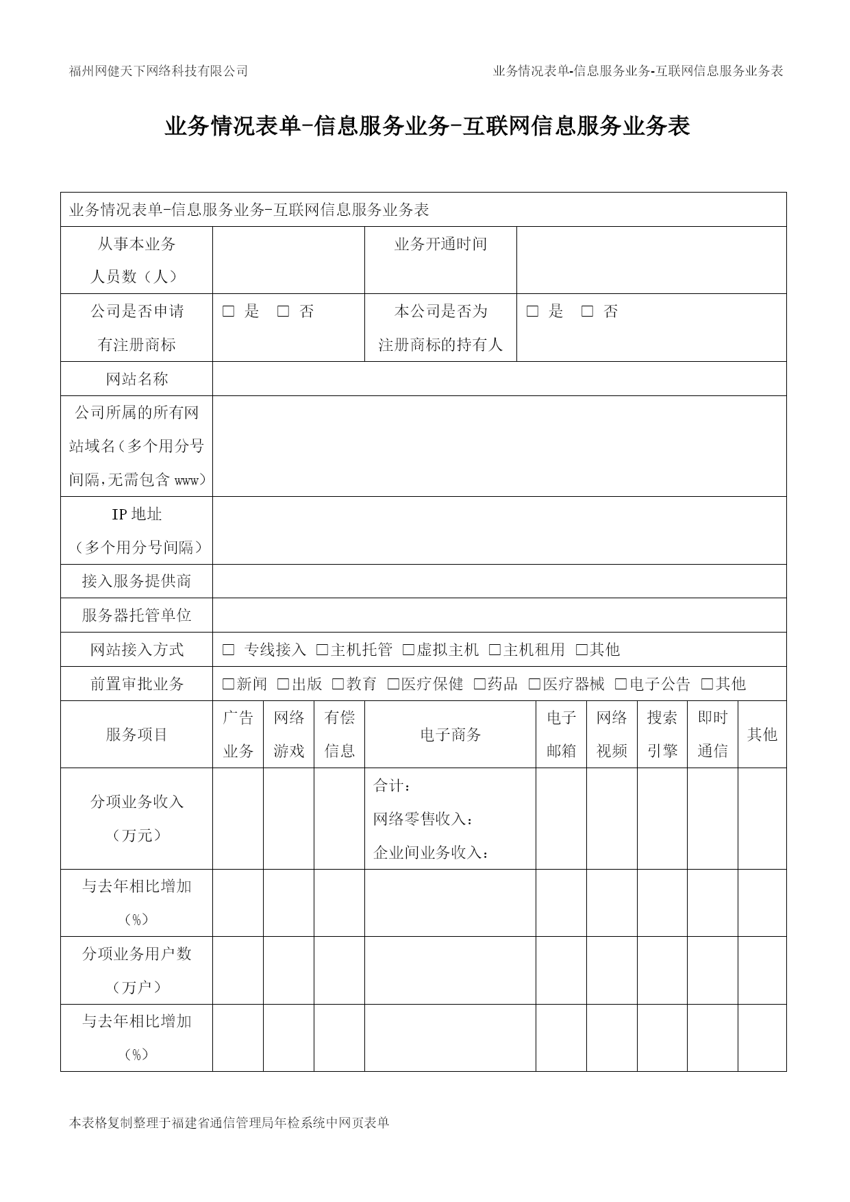 福州网健天下网络科技有限公司业务情况表单-信息服务业务-互联网信息服务业务表本表格复制整理于福建省通信管理局年检系统中网页表单业务情况表单-信息服务业务-互联网信息服务业务表业务情况表单-信息服务业务-互联网信息服务业务表从事本业务人员数(人)业务开通时间公司是否申请有注册商标□是□否本公司是否为注册商标的持有人□是□否网站名称公司所属的所有网站域名(多个用分号间隔,无需包含www)IP地址(多个用分号间隔)接入服务提供商服务器托管单位网站接入方式□专线接入□主机托管□虚拟主机□主机租用□其他前置审批业务