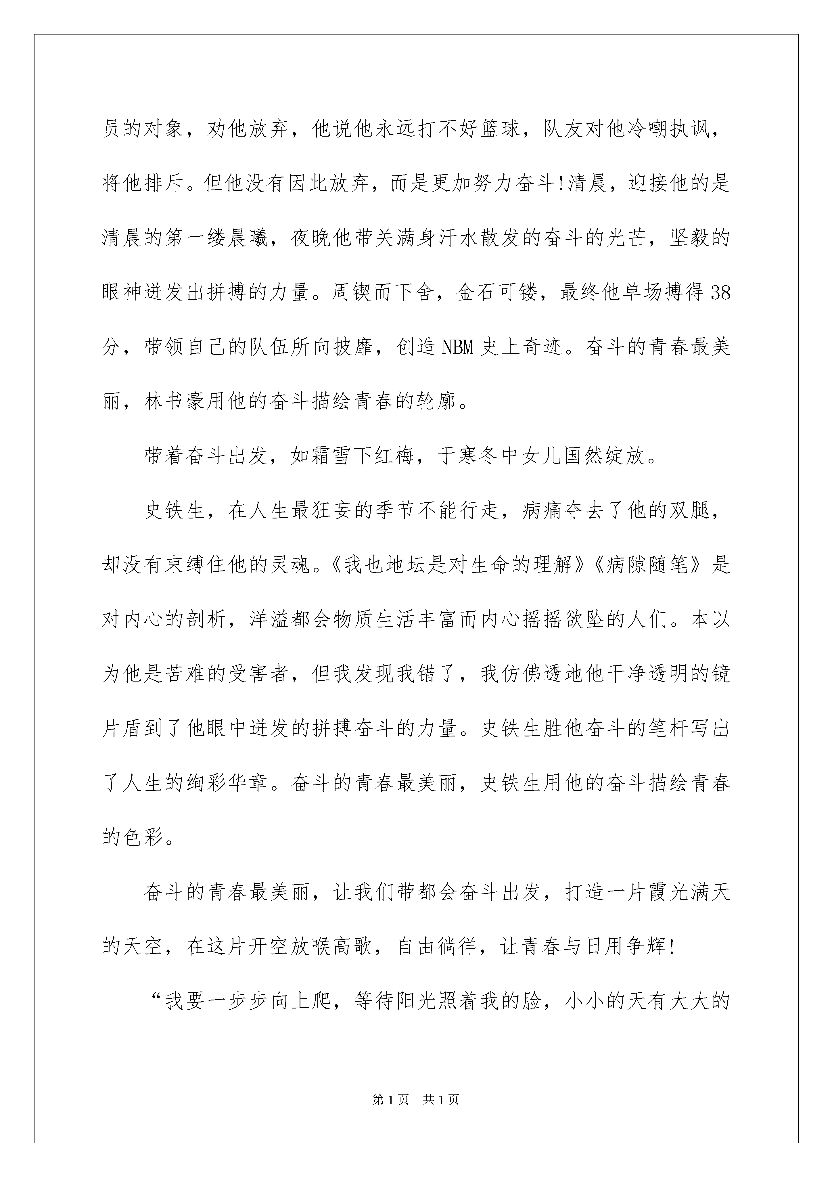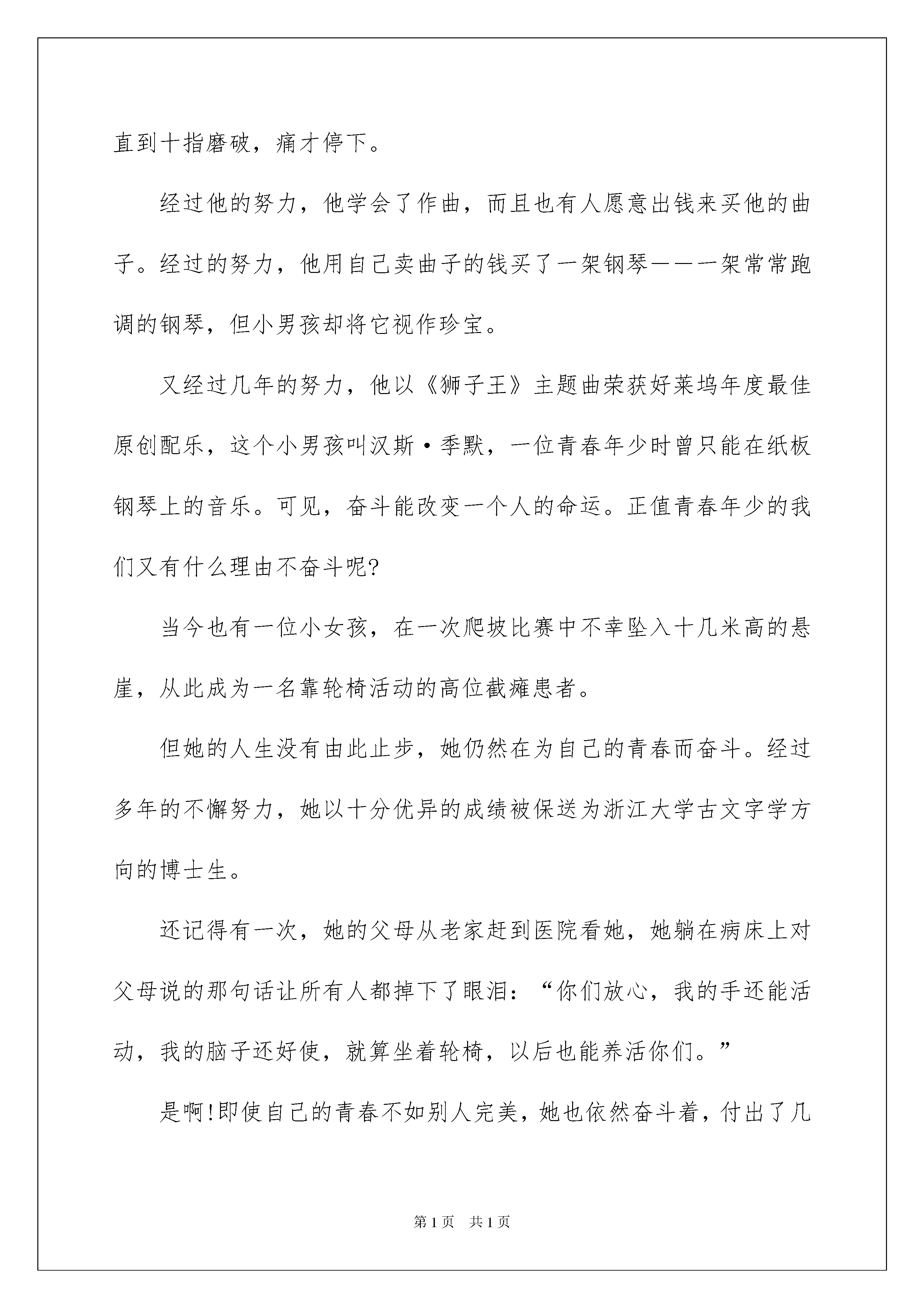 此资料由网络收集而来,如有侵权请告知上传者立即删除。资料共分享,我们负责传递知识。励志演讲稿:青春是美好的青春不仅仅是一声声的赞美,它更是拥有使命并为之奋斗不息的源泉。因为生命的光环一个个被践踏的躯体赋予了新的灵魂;因为青春的绚丽,一个个飞舞的思绪会聚成一首悲壮的挽歌。时光的老人又一次送来了五月,迎来了又一个”;五四”;青年节。在这阳光灿烂,安宁详和的幸福生活之时,我不禁想起了那些曾为中华民族的民主,科学,独立而抛头颅洒热血的青年们,是他们,在民族遭受屈辱的时刻挺身而出,以力挽狂澜之势救黎民于苦难。在斗争