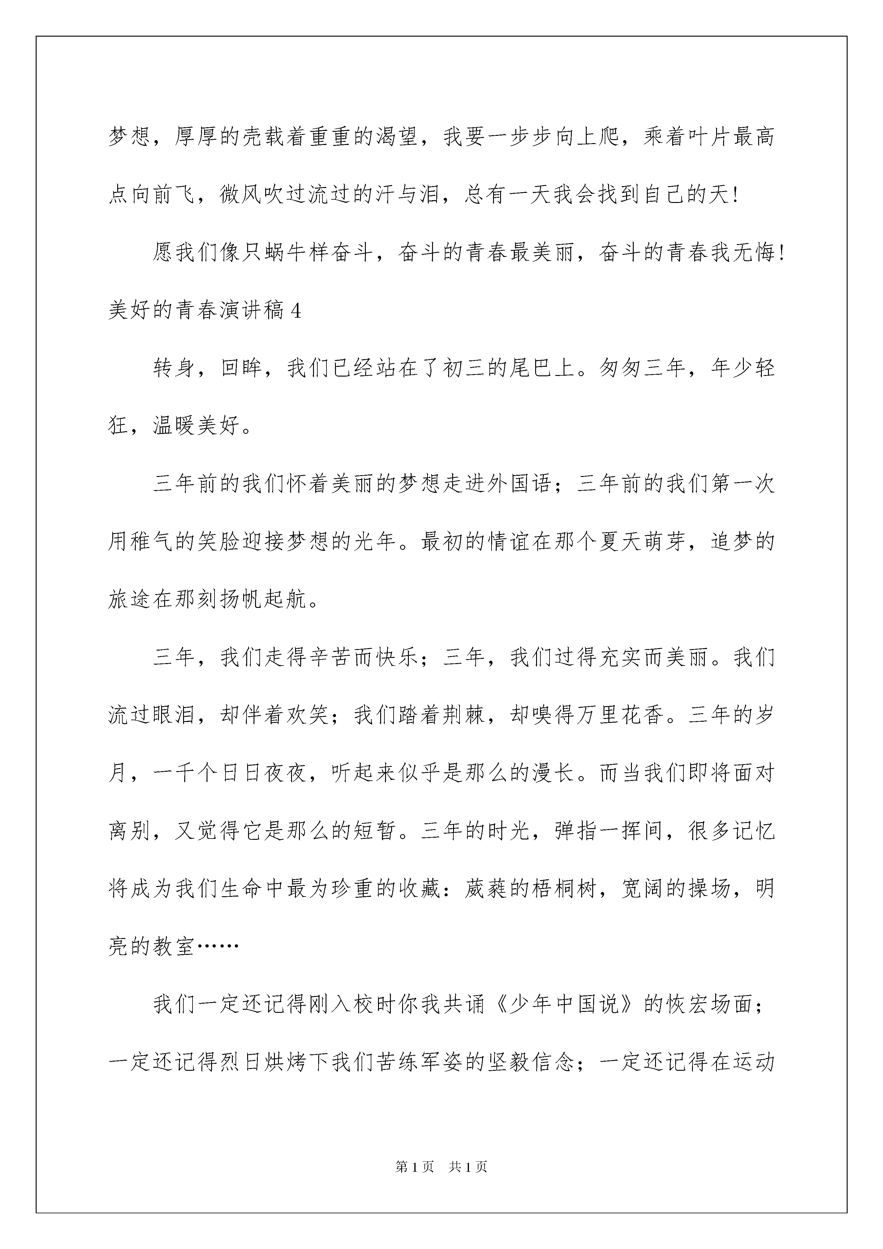 2022美好的青春演讲稿美好的青春演讲稿演讲稿可以帮助发言者更好的表达。在日常生活和工作中,在很多情况下我们需要用到演讲稿,演讲稿的注意事项有许多,你确定会写吗?下面是我收集整理的美好的青春演讲稿,仅供参考,欢迎大家阅读。美好的青春演讲稿1各位老师,各位同学:青春是一道绚丽的风景,一串跳动的音符。青春是躁动的,青涩的,青春更是热情的,生动的。青春的我
