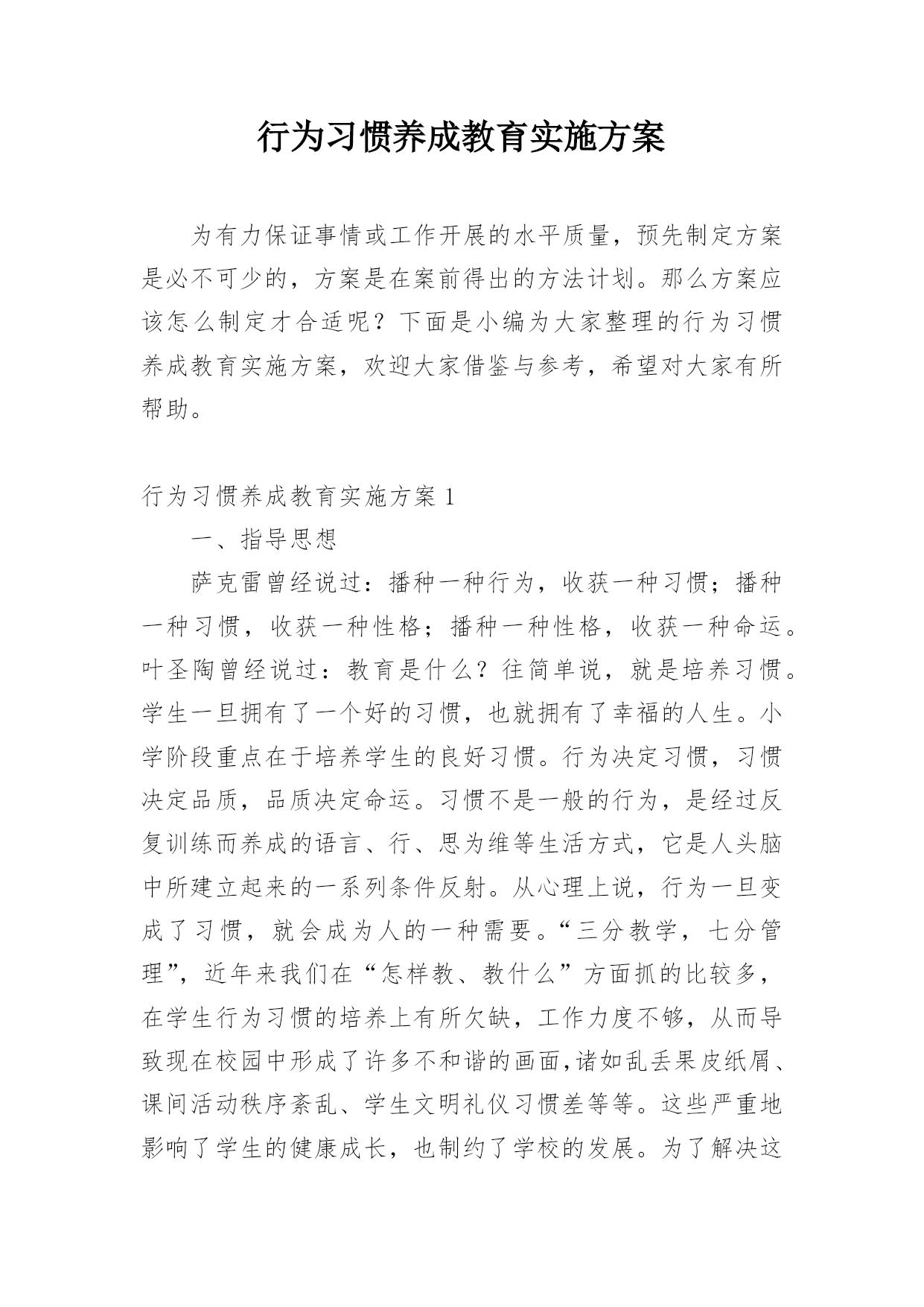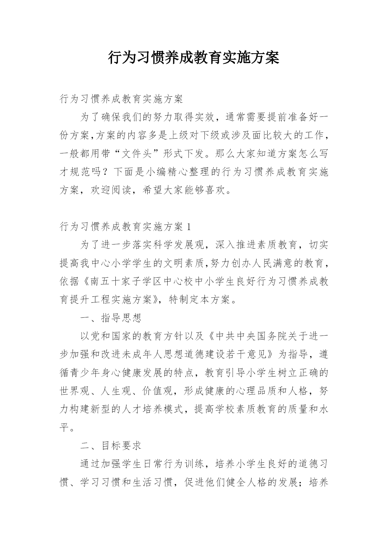 行为习惯养成教育实施方案行为习惯养成教育实施方案为了确保我们的努力取得实效,通常需要提前准备好一份方案,方案的内容多是上级对下级或涉及面比较大的工作,一般都用带“文件头”形式下发。那么大家知道方案怎么写才规范吗?下面是小编精心整理的行为习惯养成教育实施方案,欢迎阅读,希望大家能够喜欢。行为习惯养成教育实施方案1为了进一步落实科学发展观,深入推进素质教育,切实提高我中心小学学生的文明素质,努力创办人民满意的教育,依据《南五十家子学区中心校中小学生良好行为习惯养成教育提升工程实施方案》,特制定本方案。一、指导