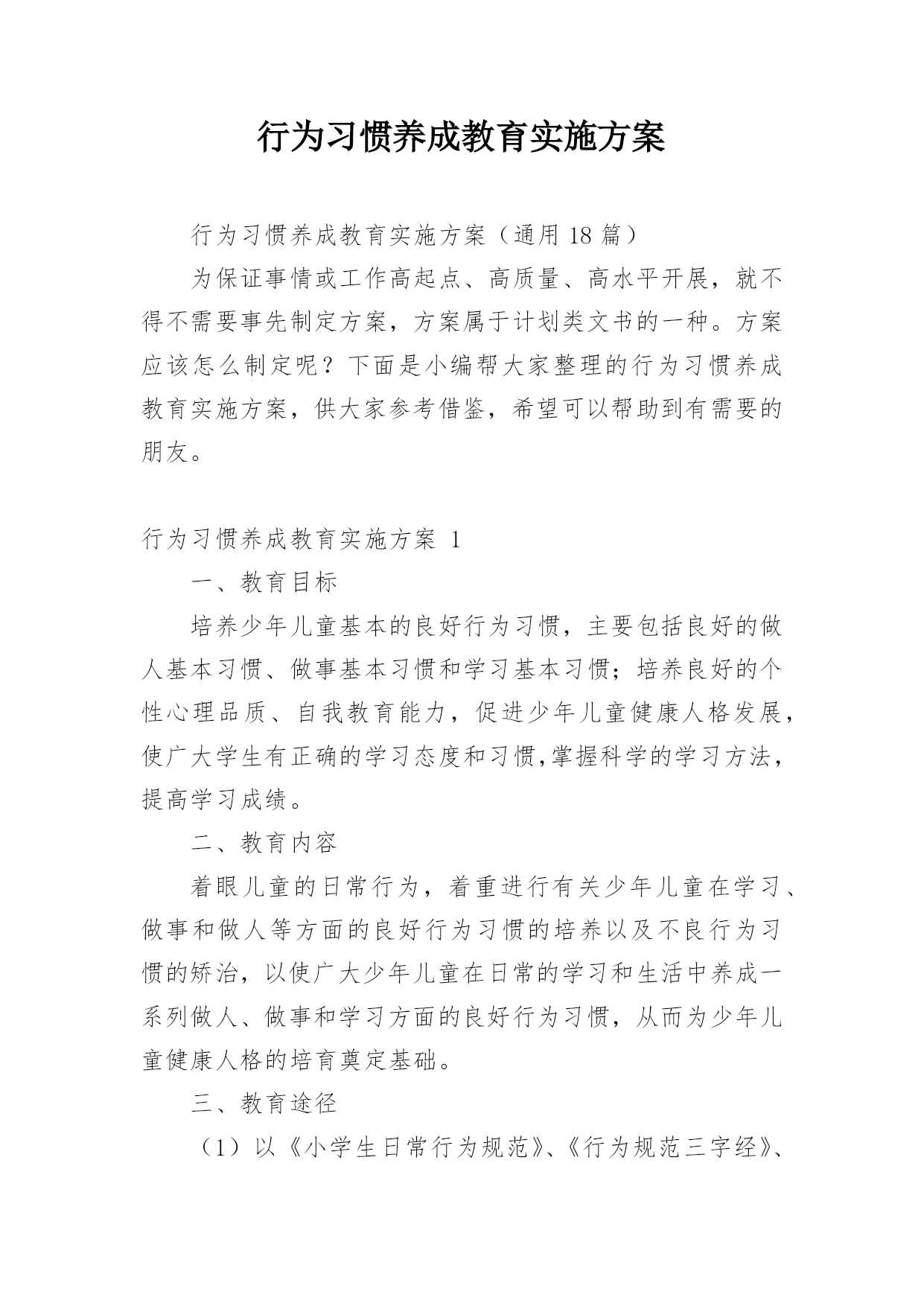 行为习惯养成教育实施方案行为习惯养成教育实施方案(通用18篇)为保证事情或工作高起点、高质量、高水平开展,就不得不需要事先制定方案,方案属于计划类文书的一种。方案应该怎么制定呢?下面是小编帮大家整理的行为习惯养成教育实施方案,供大家参考借鉴,希望可以帮助到有需要的朋友。行为习惯养成教育实施方案1一、教育目标培养少年儿童基本的良好行为习惯,主要包括良好的做人基本习惯、做事基本习惯和学习基本习惯;培养良好的个性心理品质、自我教育能力,促进少年儿童健康人格发展,使广大学生有正确的学习态度和习惯,掌握科学的学习方