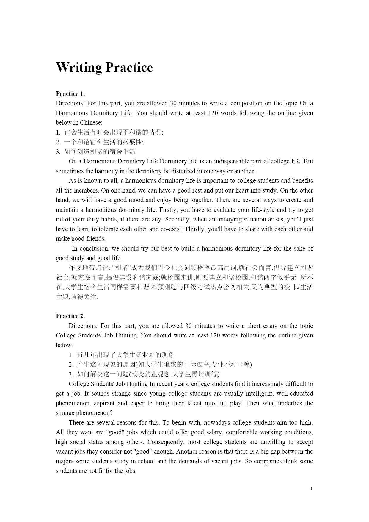 WritingPracticePractice1.Directions:Forthispart,youareallowed30minutestowriteacompositiononthetopicOnaHarmoniousDormitoryLife.Youshouldwriteatleast120wordsfollowingtheoutlinegivenbelowinChinese:1.宿舍生活有时会出现不和谐的情况;2.一个和谐宿舍生活的必要性;3.如何创造和谐的宿舍生活