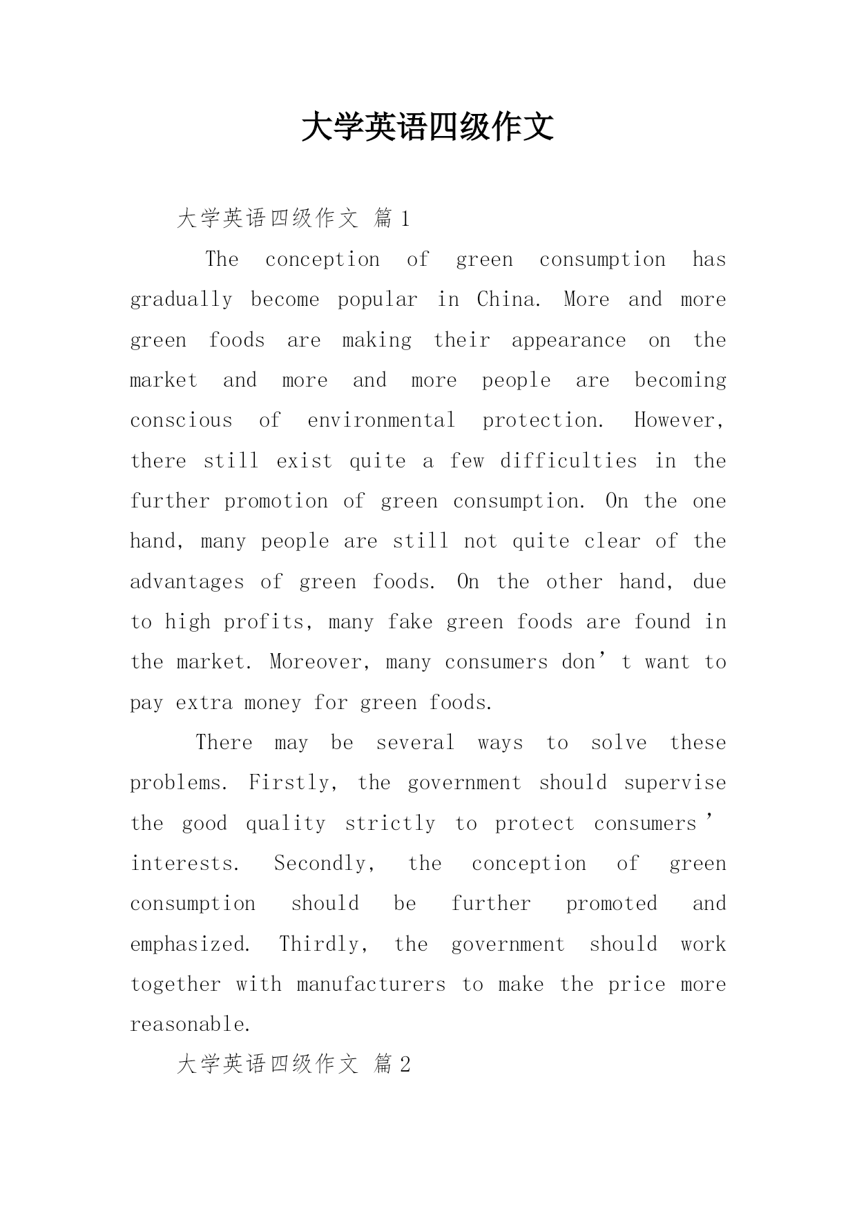 大学英语四级作文大学英语四级作文篇1TheconceptionofgreenconsumptionhasgraduallybecomepopularinChina.Moreandmoregreenfoodsaremakingtheirappearanceonthemarketandmoreandmorepeoplearebecomingconsciousofenvironmentalprotection.However,therestillexistquiteafewdifficultiesinthefu