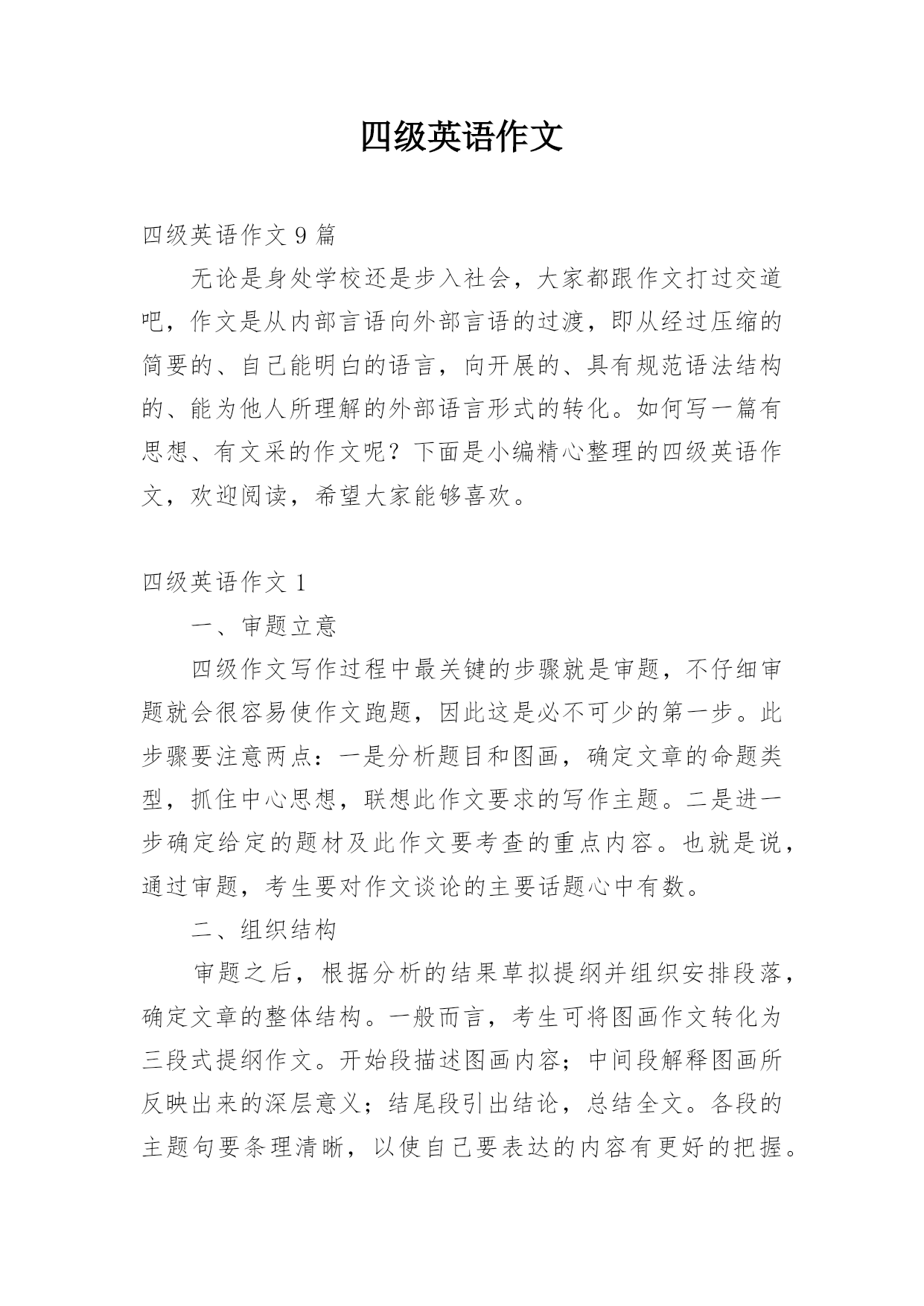 四级英语作文四级英语作文9篇无论是身处学校还是步入社会,大家都跟作文打过交道吧,作文是从内部言语向外部言语的过渡,即从经过压缩的简要的、自己能明白的语言,向开展的、具有规范语法结构的、能为他人所理解的外部语言形式的转化。如何写一篇有思想、有文采的作文呢?下面是小编精心整理的四级英语作文,欢迎阅读,希望大家能够喜欢。四级英语作文1一、审题立意四级作文写作过程中最关键的步骤就是审题,不仔细审题就会很容易使作文跑题,因此这是必不可少的第一步。此步骤要注意两点:一是分析题目和图画,确定文章的命题类型,抓住中心思想
