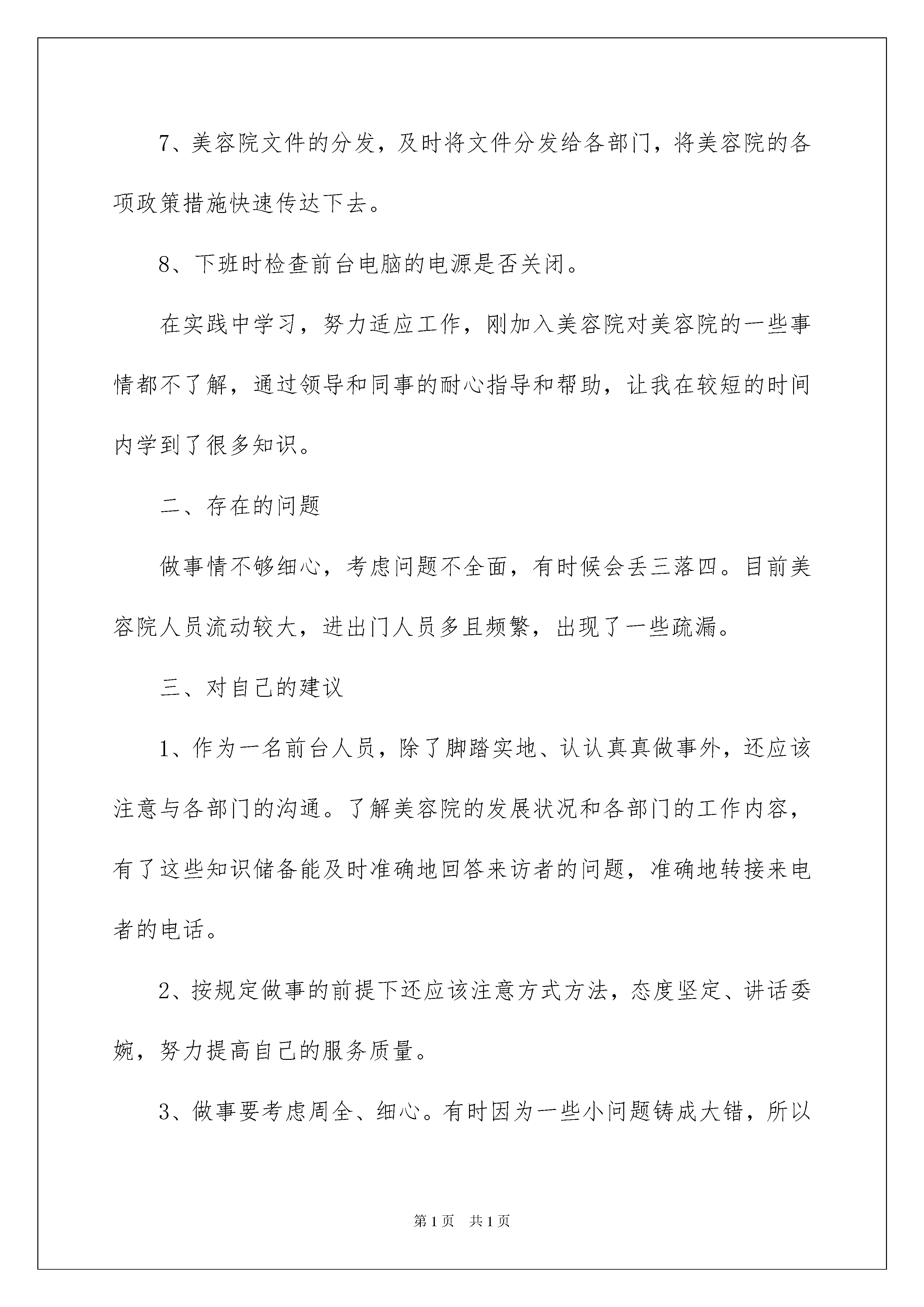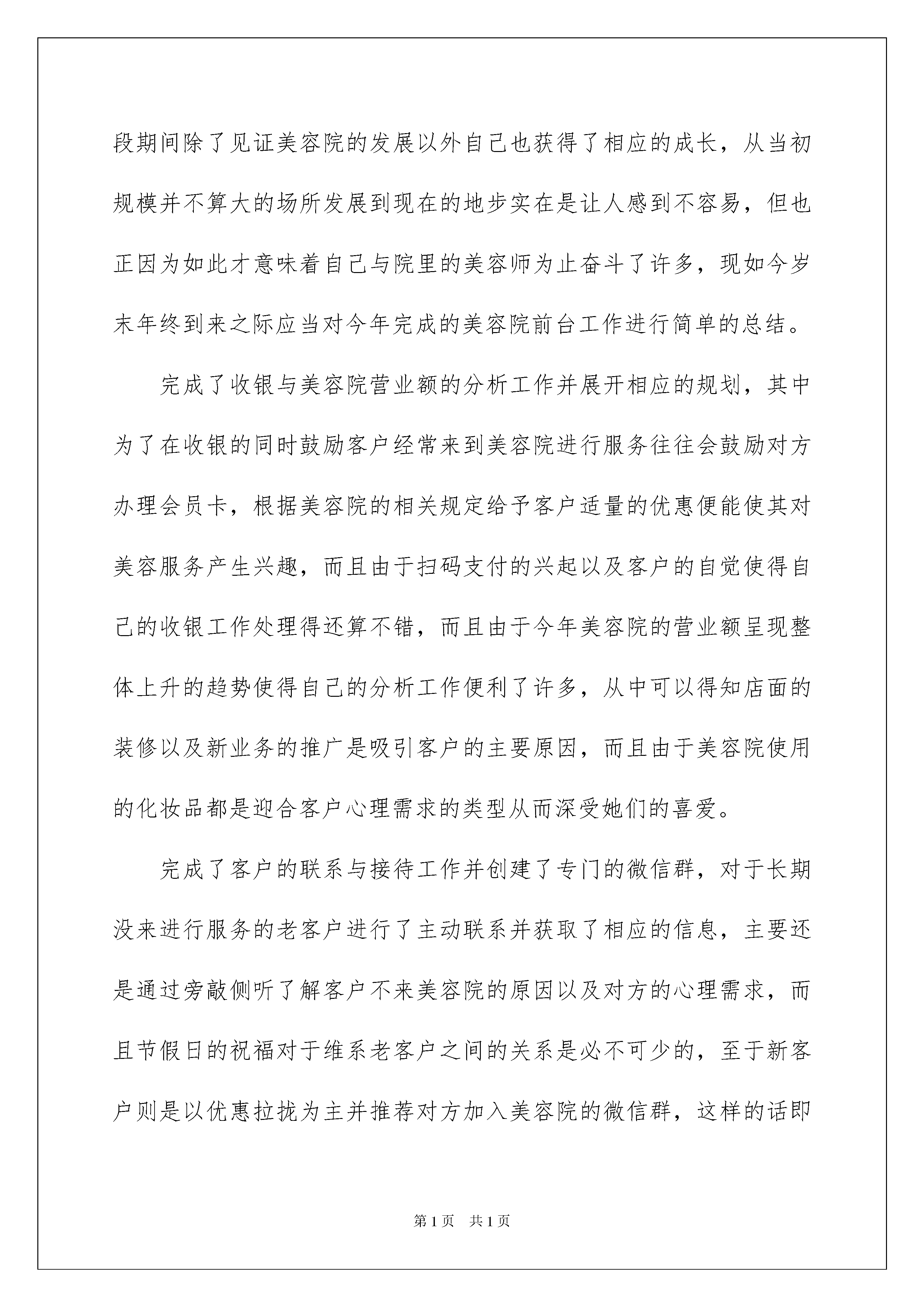 2022美容前台工作总结美容前台工作总结总结是把一定阶段内的有关情况分析研究,做出有指导性结论的书面材料,它可以帮助我们有寻找学习和工作中的规律,让我们来为自己写一份总结吧。那么总结要注意有什么内容呢?下面是我整理的美容前台工作总结,仅供参考,大家一起来看看吧。美容前台工作总结1在这岁末年初之际,回首过去,展望未来!过去的10月份开始,在美容院的指引
