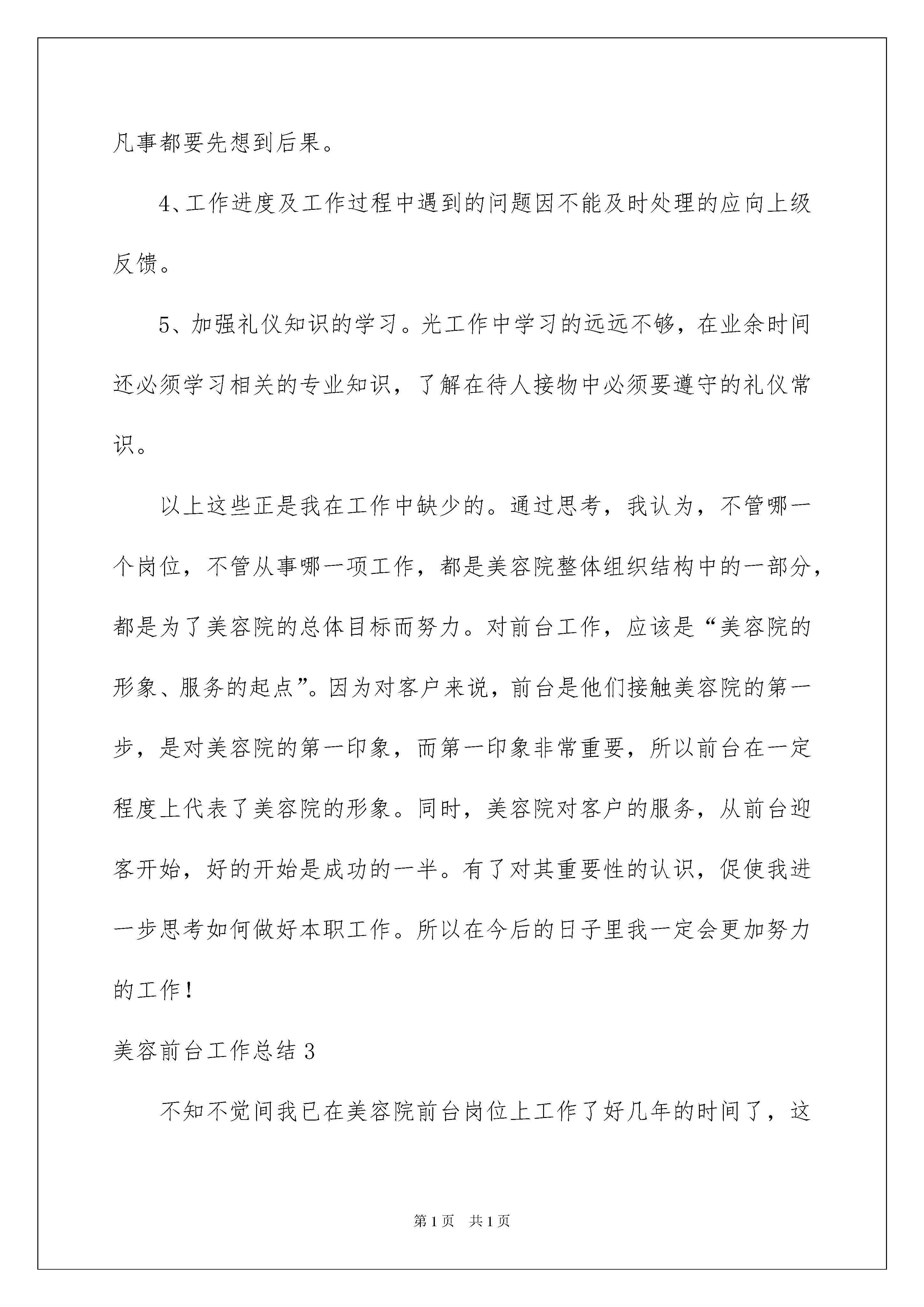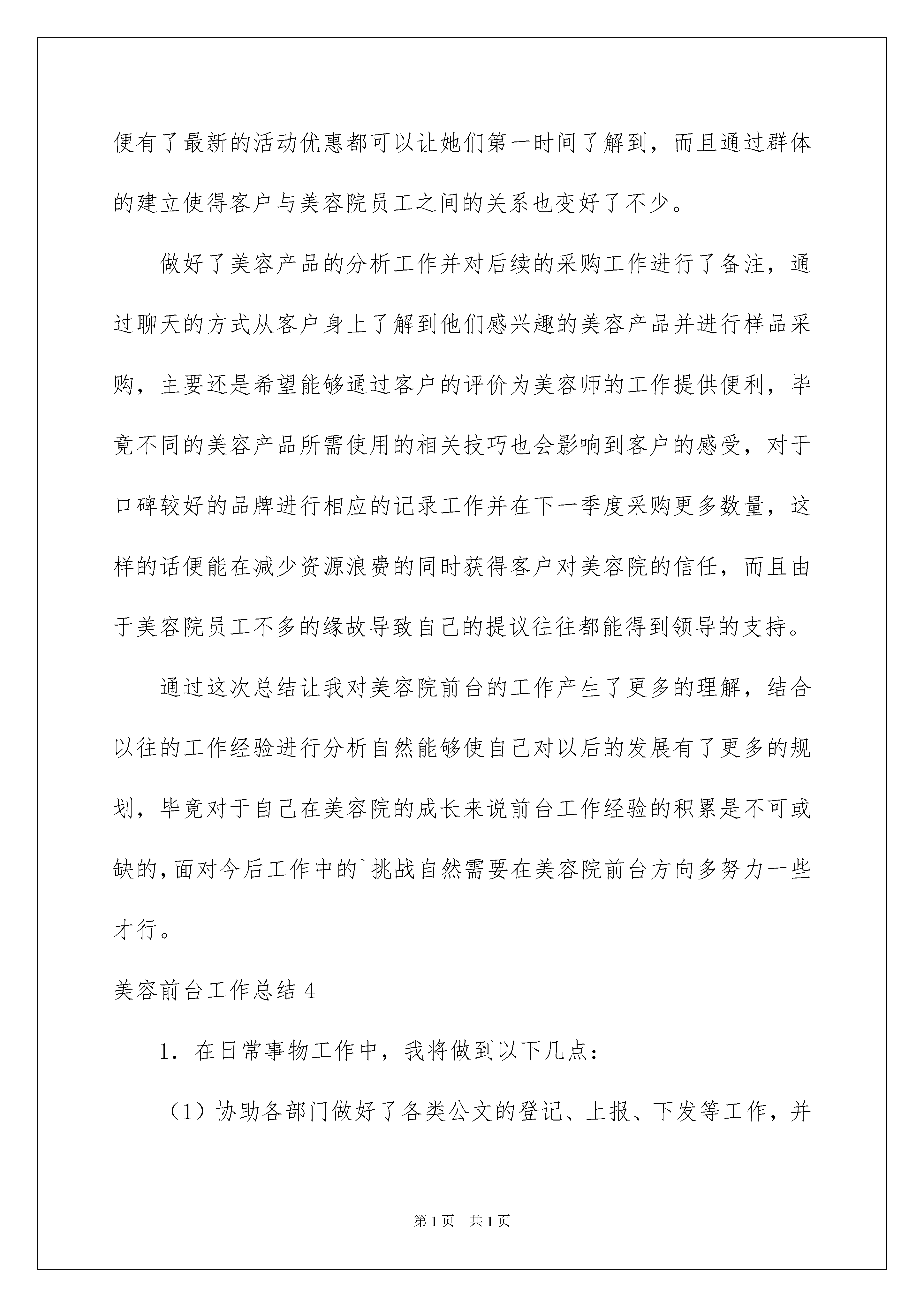 2022美容前台工作总结美容前台工作总结总结是把一定阶段内的有关情况分析研究做出有指导性结论的书面材料它可以帮助我们有寻找学习和工作中的规律让我们来为自己写一份总结吧。那么总结要注意有什么内容呢?下面是我整理的美容前台工作总结