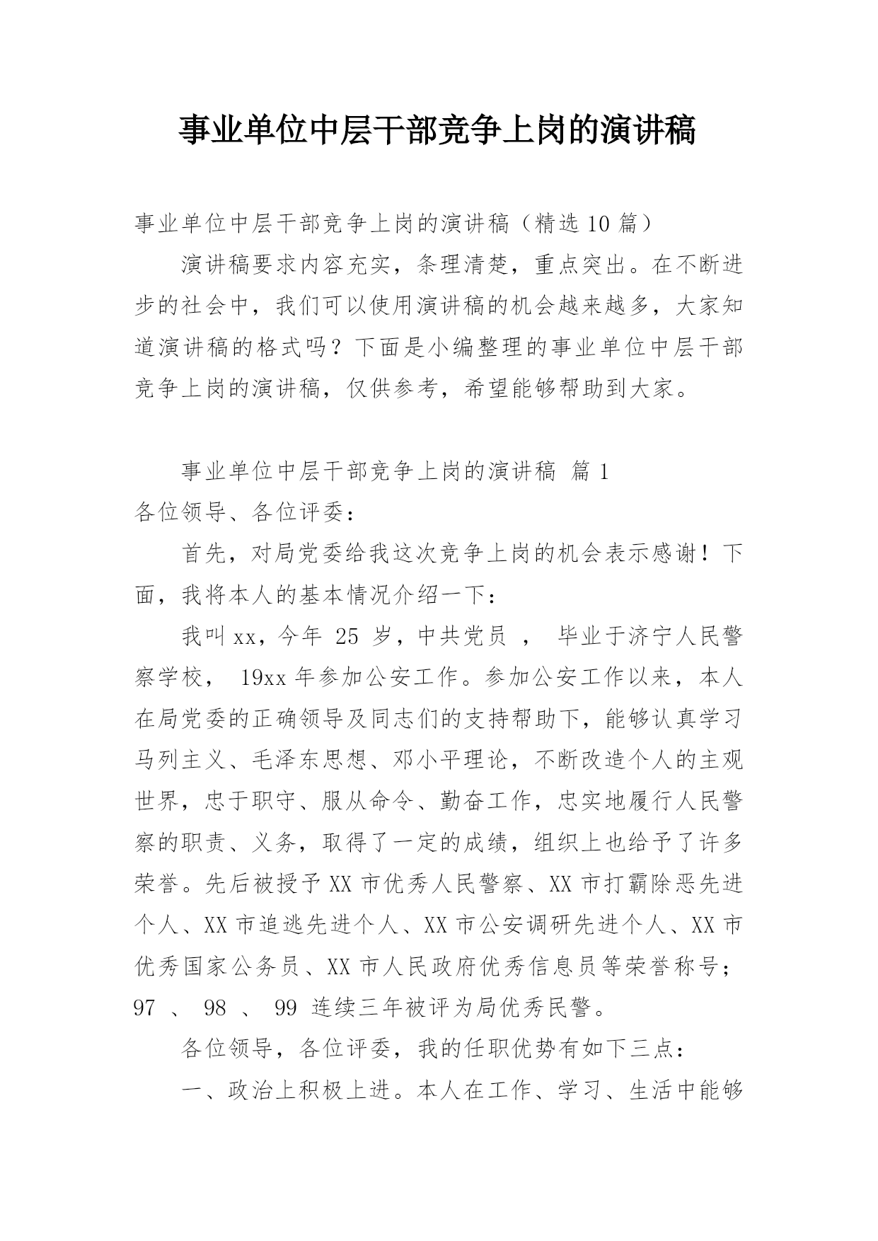 事业单位中层干部竞争上岗的演讲稿事业单位中层干部竞争上岗的演讲稿(精选10篇)演讲稿要求内容充实,条理清楚,重点突出。在不断进步的社会中,我们可以使用演讲稿的机会越来越多,大家知道演讲稿的格式吗?下面是小编整理的事业单位中层干部竞争上岗的演讲稿,仅供参考,希望能够帮助到大家。事业单位中层干部竞争上岗的演讲稿篇1各位领导、各位评委:首先,对局党委给我这次竞争上岗的机会表示感谢!下面,我将本人的基本情况介绍一下:我叫xx,今年25岁,中共党员,毕业于济宁人民警察学校,19xx年参加公安工作。参加公安工作以来,