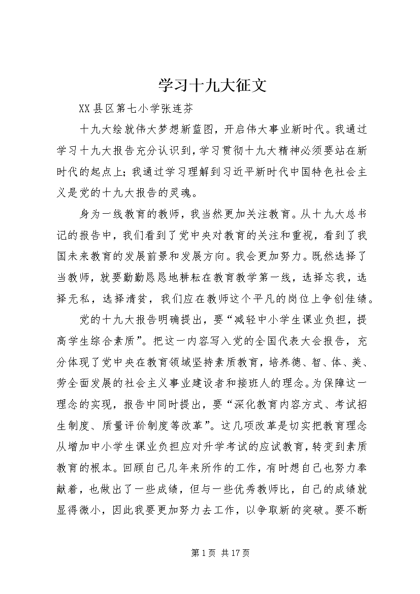 学习十九大征文XX县区第七小学张连芬十九大绘就伟大梦想新蓝图,开启伟大事业新时代。我通过学习十九大报告充分认识到,学习贯彻十九大精神必须要站在新时代的起点上;我通过学习理解到习近平新时代中国特色社会主义是党的十九大报告的灵魂。身为一线教育的教师,我当然更加关注教育。从十九大总书记的报告中,我们看到了党中央对教育的关注和重视,看到了我国未来教育的发展前景和发展方向。我会更加努力。既然选择了当教师,就要勤勤恳恳地耕耘在教育教学第一线,选择忘我,选择无私,选择清贫,我们应在教师这个平凡的岗位上争创佳绩。党的十九