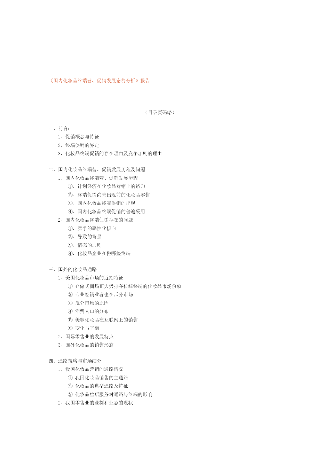 编号:时间:2021年x月x日书山有路勤为径学海无涯苦作舟页码:《国内化妆品终端营、促销发展态势分析》报告第87届(上海)中国化妆品洗涤美容用品交易会化妆品专业市场商务论坛美容化妆品行业高级咨询顾问、撰稿人、演讲者:陈曦E-mail:boyazixunxpublic.cta.cqx直线x023-67755811(目录页码略)一、前言:1、促销概念与特征2、终端促销的界定3、化妆品终端促销的存在理由及竞争加剧的理由二、国内化妆品终端营、促销