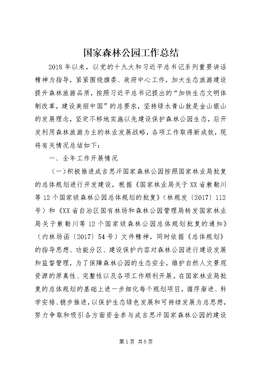 第PAGE\*Arabic\*MERGEFORMAT6页共NUMPAGES\*MERGEFORMAT6页国家森林公园工作总结2018年以来,以党的十九大和习近平总书记系列重要讲话精神为指导,紧紧围绕旗委、政府中心工作,加大生态旅游建设提升森林旅游品质,按照习近平总书记提出的“加快生态文明体制改革,建设美丽中国”的总要求,坚持绿水青山就是金山银山的发展理念,坚定不移地实施以先建设保护森林公园生态,后开发利用森林旅游为主的林业发展战略,各项工作取得新成效,现将有关情况总结如下:一、全年工作开展情况