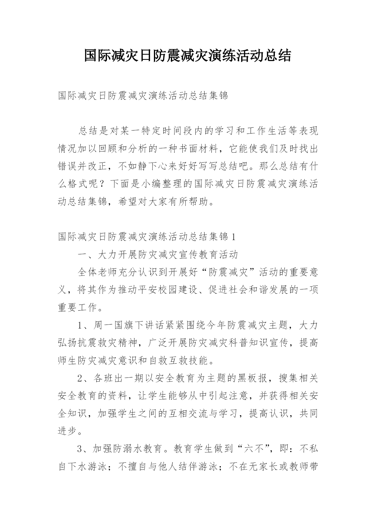 国际减灾日防震减灾演练活动总结国际减灾日防震减灾演练活动总结集锦总结是对某一特定时间段内的学习和工作生活等表现情况加以回顾和分析的一种书面材料,它能使我们及时找出错误并改正,不如静下心来好好写写总结吧。那么总结有什么格式呢?下面是小编整理的国际减灾日防震减灾演练活动总结集锦,希望对大家有所帮助。国际减灾日防震减灾演练活动总结集锦1一、大力开展防灾减灾宣传教育活动全体老师充分认识到开展好“防震减灾”活动的重要意义,将其作为推动平安校园建设、促进社会和谐发展的一项重要工作。1、周一国旗下讲话紧紧围绕今年防震减